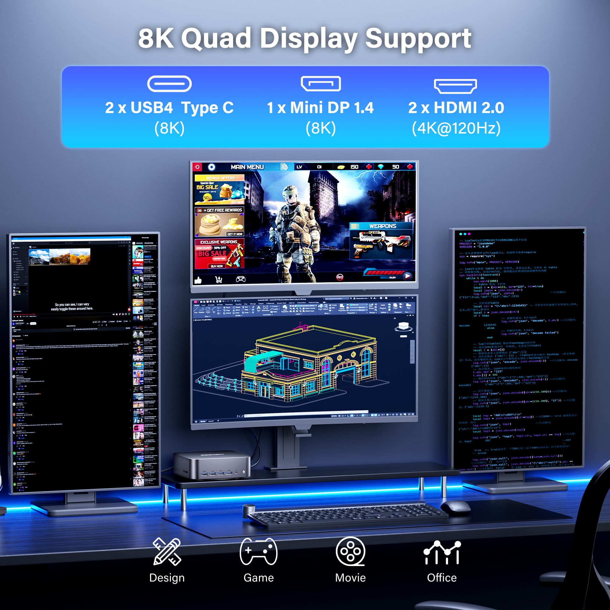 ๐ใ๐๐บ๐บ๐ฒ๐ฟ๐๐ถ๐๐ฒ ๐ด๐ ๐ค๐๐ฎ๐ฑ ๐๐ถ๐๐ฝ๐น๐ฎ๐ & ๐ฃ๐ฟ๐ผ ๐๐ผ๐ป๐ป๐ฒ๐ฐ๐๐ถ๐๐ถ๐๐ใExperience unmatched versatility with the GT15 Max mini PC, featuring dual USB4 ports (40Gbps, 8K video, 15W PD) that deliver wider compatibility and greater convenience than OCuLink. Equipped with two HDMI 2.0 (4K@120Hz), one Mini DP 1.4 (8K), and dual 2.5G LAN ports, it supports up to four simultaneous displaysโtwo at 8K and two at 4K. Perfect for gaming, video editing, and immersive entertainment, this compact powerhouse seamlessly connects to eGPUs, high-speed SSDs, and VR devices, bringing desktop-level performance and stunning visual clarity to any workspace.