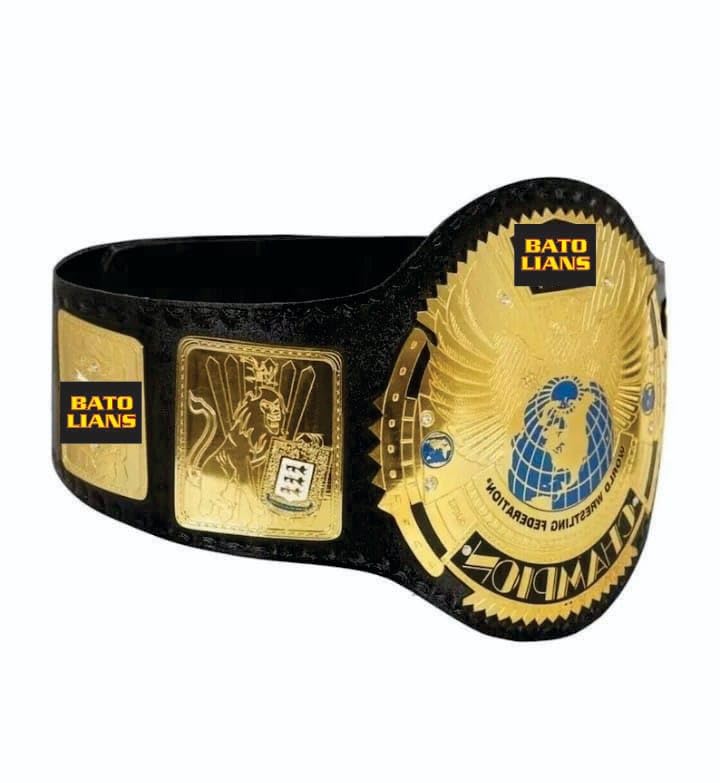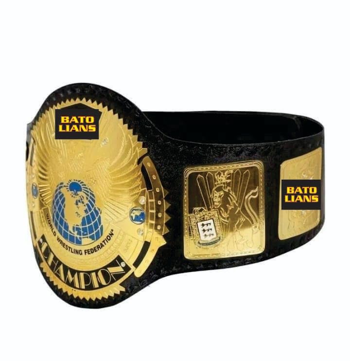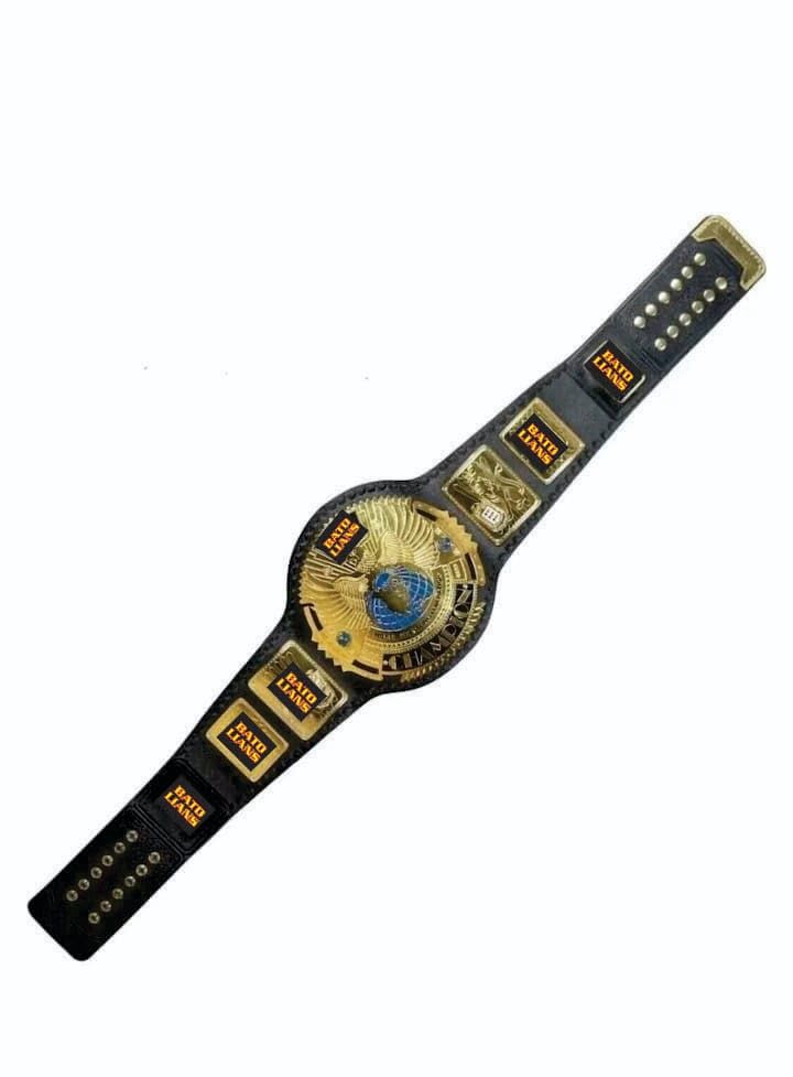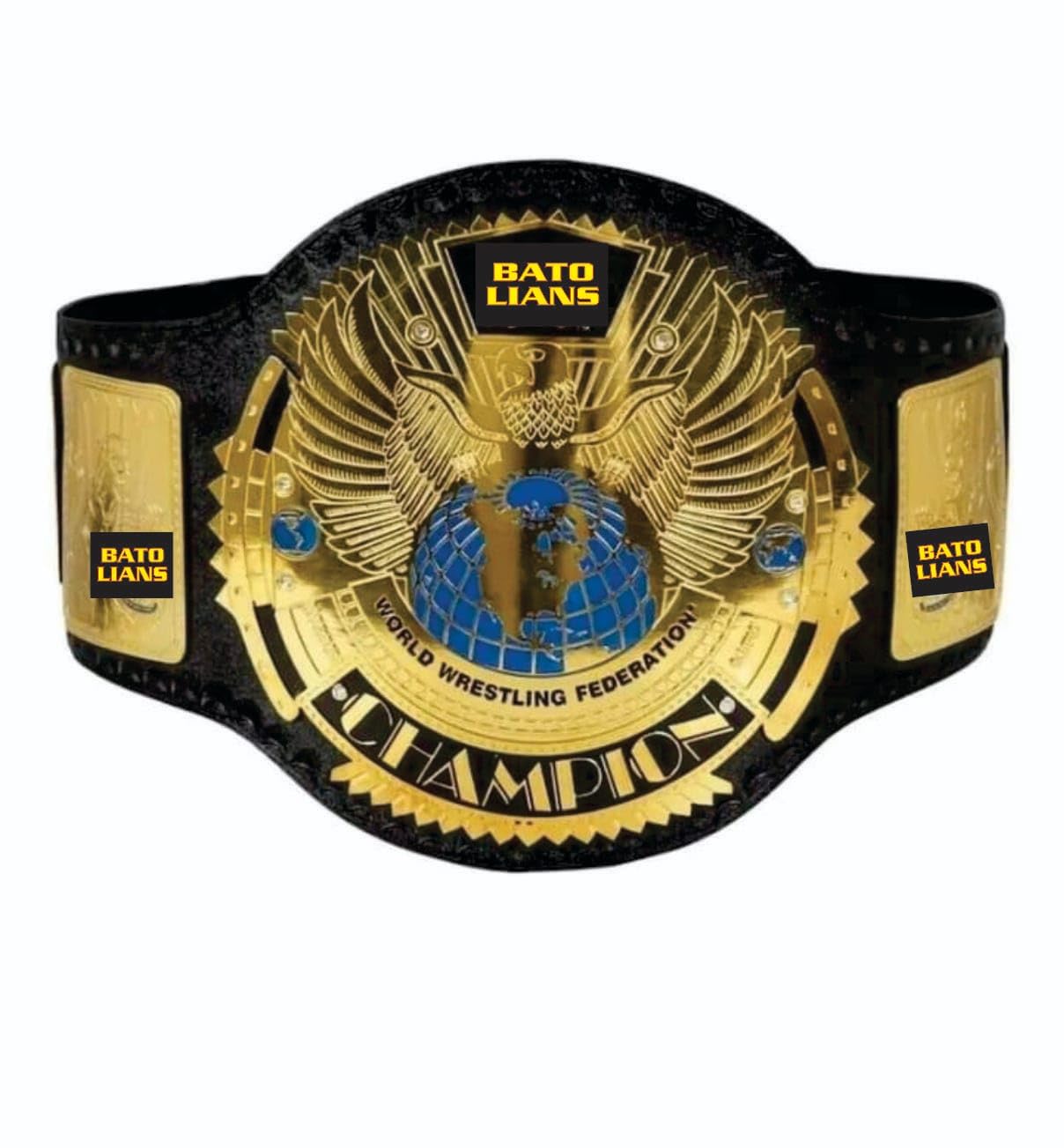 Description Own a piece of wrestling history with this magnificent Championship Belt replica. This premium collectible features the iconic big eagle design rendered in stunning gold-tone finish against a classic black leather-style strap. The centerpiece showcases a majestic eagle spreading its wings over a blue globe, symbolizing worldwide wrestling dominance. The belt's intricate details include the bold 'CHAMPION' text, multiple decorative side plates, and authentic logos throughout. The championship belt is sized for adults and includes metal studs along the strap for an authentic look. Perfect for displays, cosplay, or as a prized addition to any wrestling memorabilia collection, this belt captures the prestige and grandeur of professional wrestling's golden era. The detailed craftsmanship extends to every aspect, from the textured strap material to the precision-engineered metallic components that give it a genuine championship feel. This replica serves as an impressive display piece that will command attention in any room.