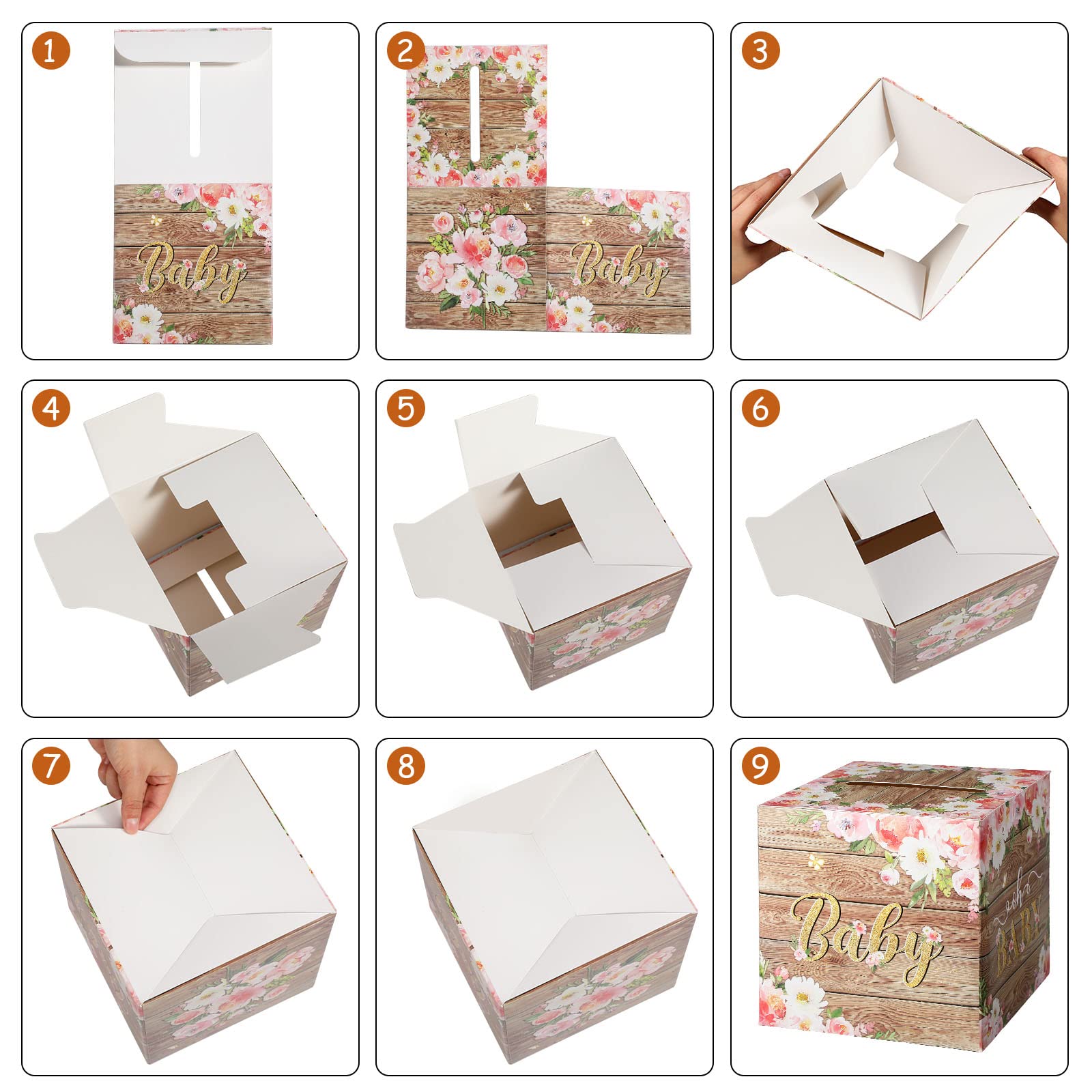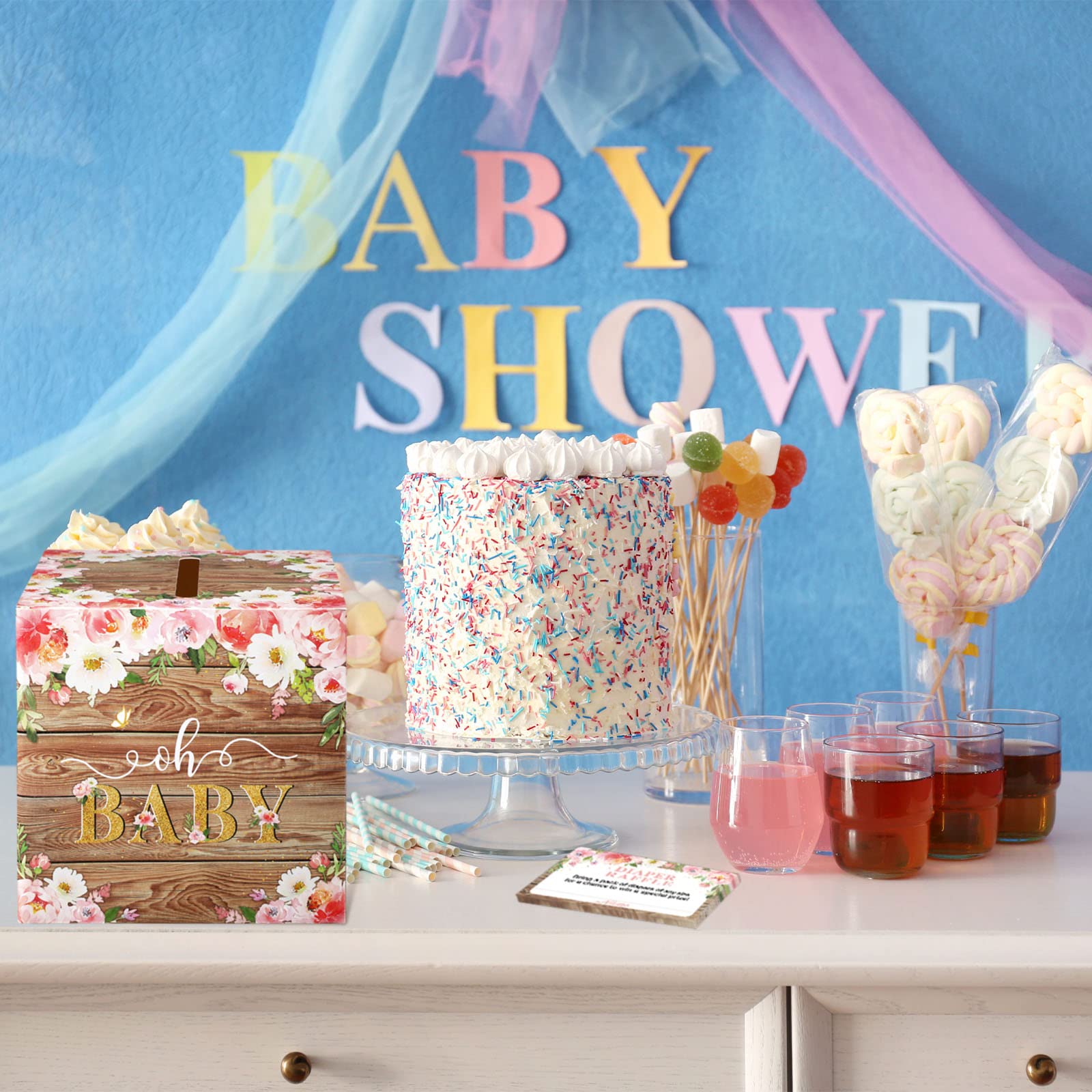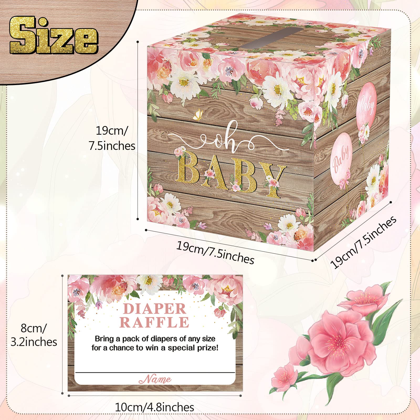 Elegant and Charming Elements: the baby shower card box is printed with multiple attractive flowers in various colors, lovely balloons and glittering words, like [Baby] and [DIAPER RUFFLE]; Moreover, there is a wide slot on the top of the box, making it easier for people to place the cards in it