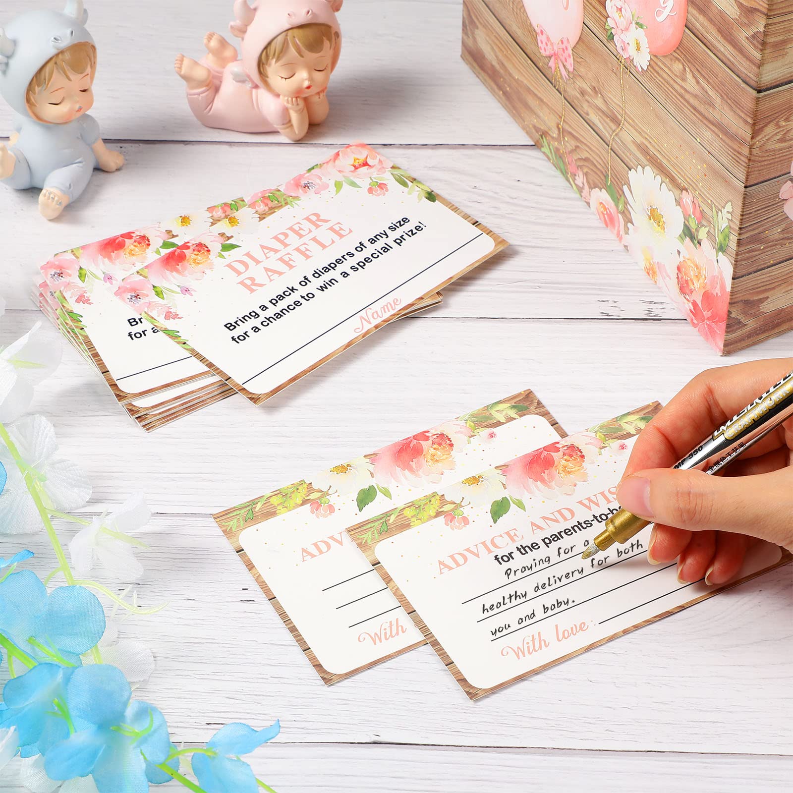 Reliable Workmanship for Exquisite Appearances: made of hard cardstock, the card box for baby shower is sturdy, thick and serviceable, hardly deforming or breaking; The floral cards are also made of cardboard, clearly printed with beautiful words and patterns, not easy to fade