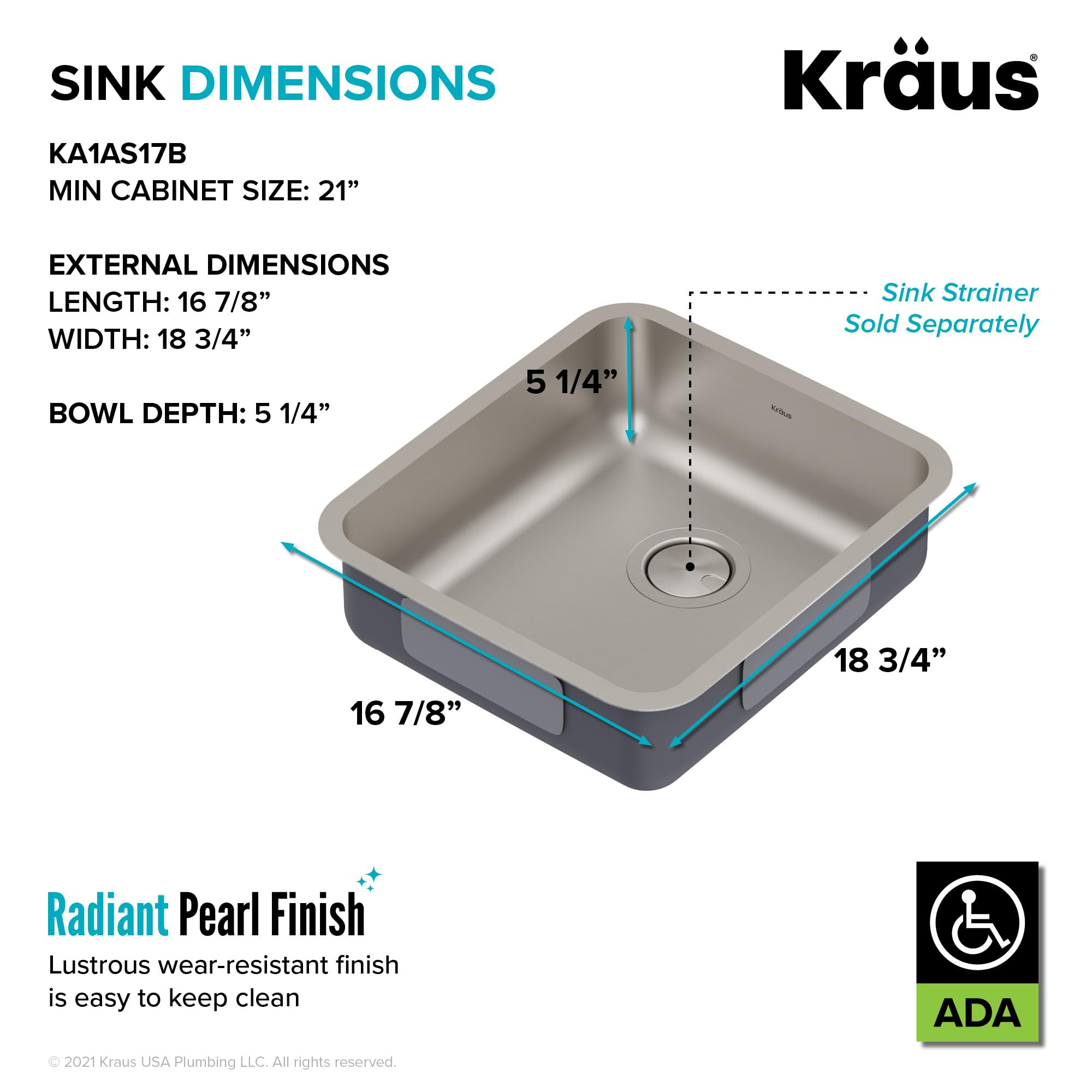 OUTER SINK DIMENSIONS: 16 7/8 in. L x 18 3/4 in. W x 5 1/2 in. D; BOWL DIMENSIONS: 15 1/8 in. L x 17 in. W x 5 1/4 in. D; Minimum Cabinet Size: 21 in.