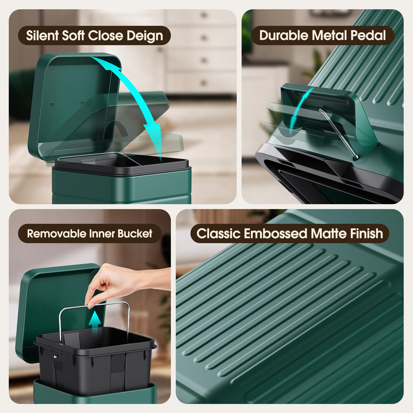 Silent Soft Close: The step trash can has a damper arrangement that retards the close of allows the lid to close quietly and safely by itself every time, don’t worry about disturbing the rest of your family
