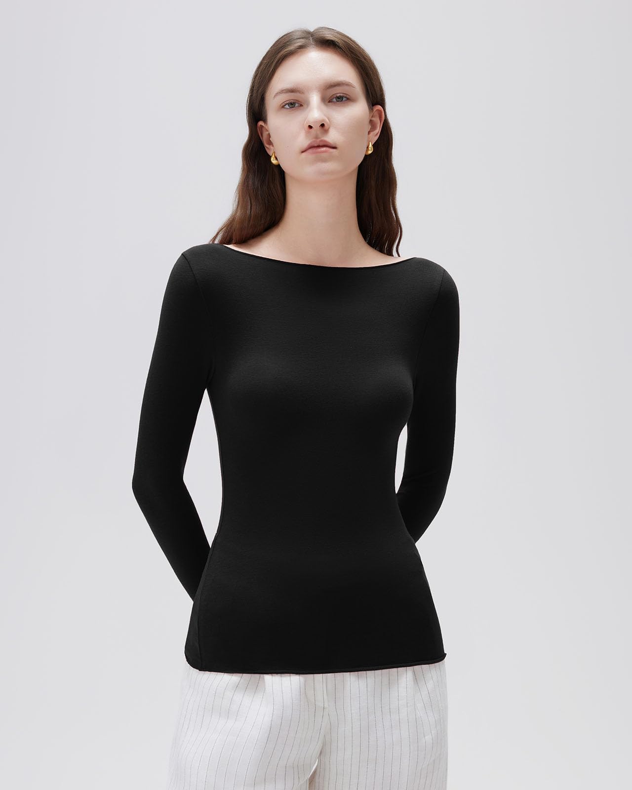 Boat Neck Fitted Tops: Classy boat neck long sleeve tops, Full length basic tees, Slim fit knit tops, Soft long sleeve shirts