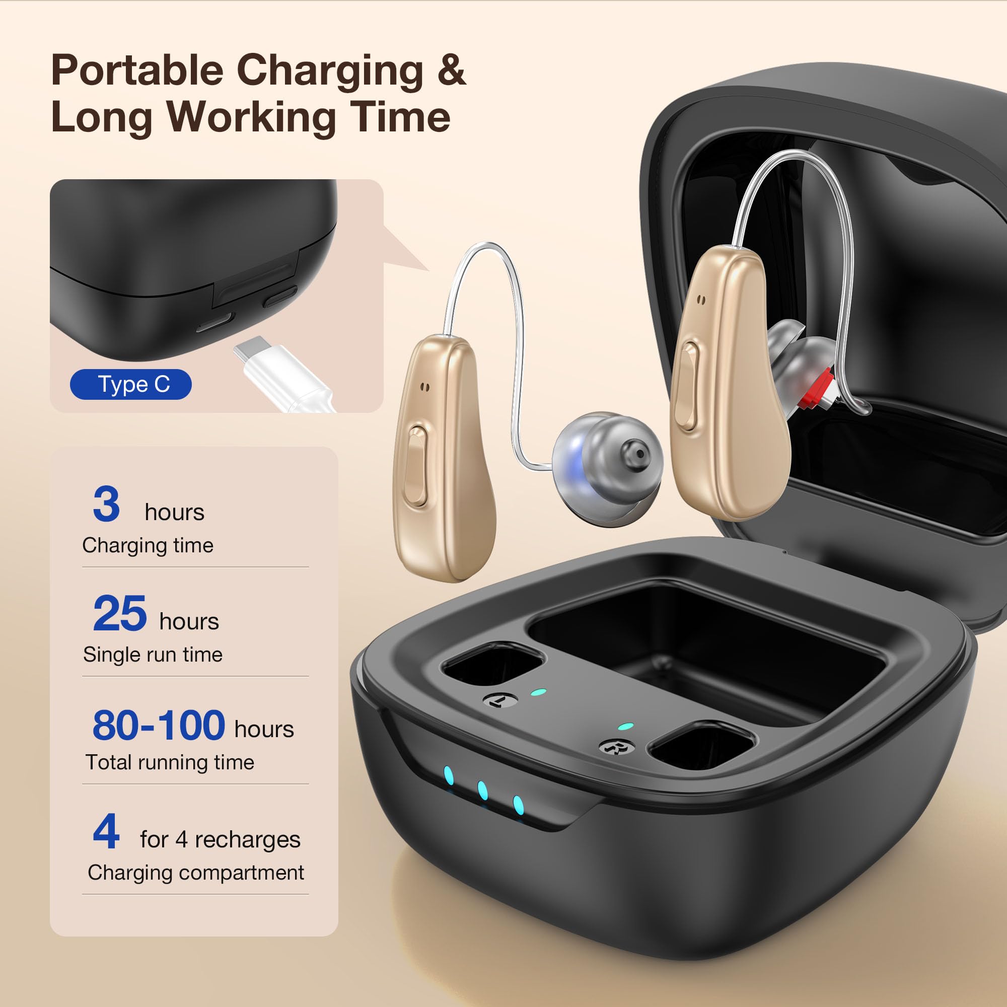 Long-lasting Battery Life : Hearing aids for seniors rechargeable with noise cancelling fast charging, charging once can continue to listen to 25 hours, combined with charging box charging can be used for 80~100 hours. Watching TV, shopping, travelling, working can be satisfied