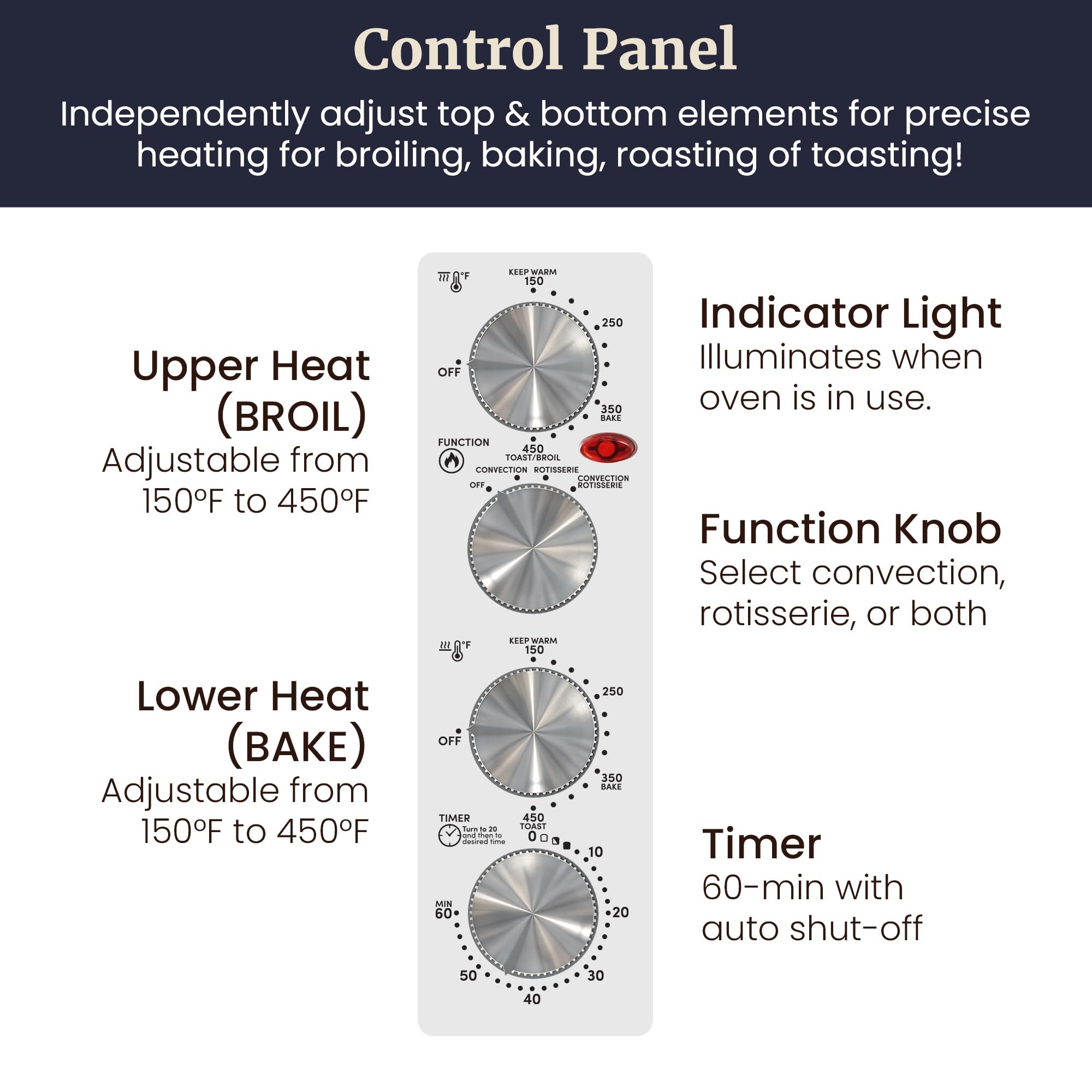 Independent Temperature Knobs up to 450°F to separately control top and bottom heating elements - turn on only one or both at the same time; 60-minute timer with signal turns oven off automatically