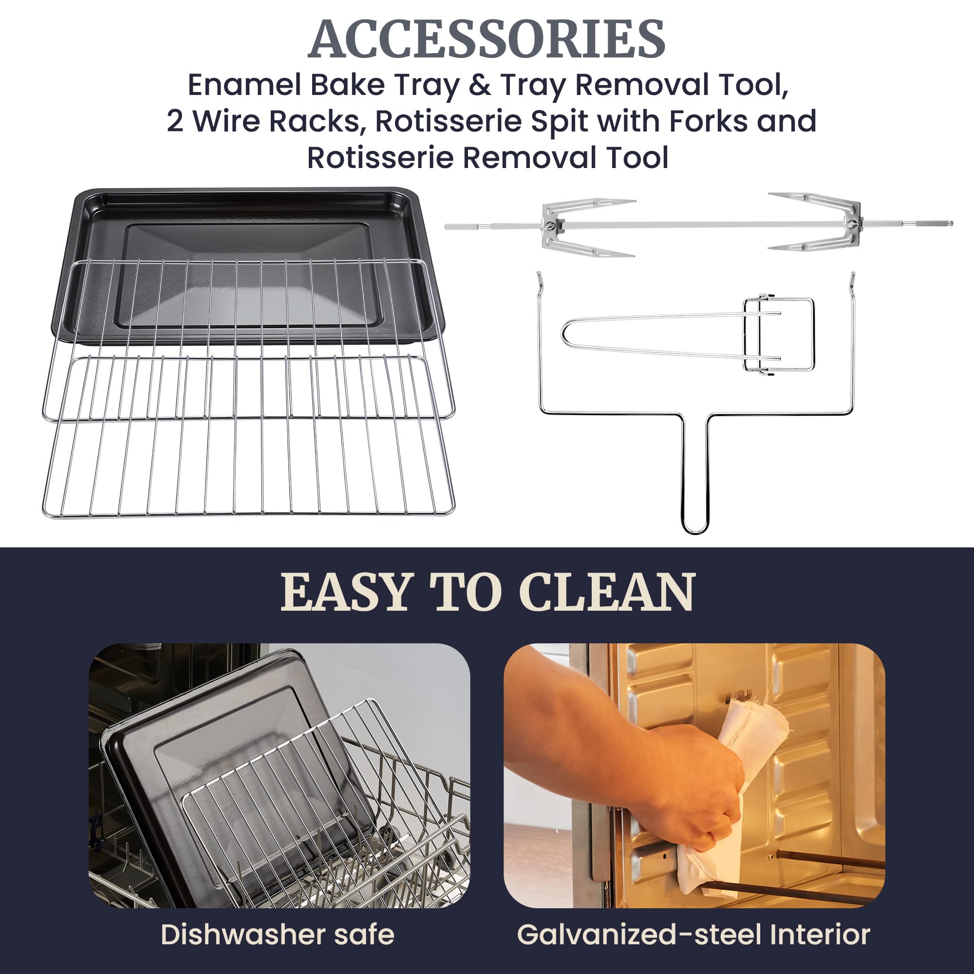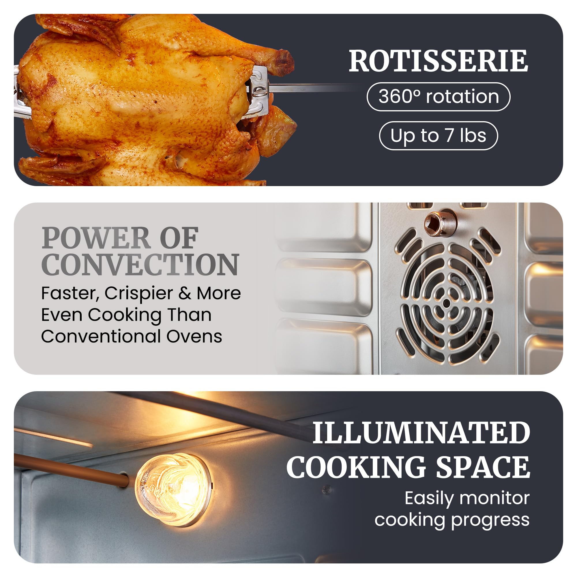 Convection feature circulates hot air inside the oven for flakier crusts, deeper flavors and more tender meats, in less time. Rotisserie spit & Fork assembly rotates food inside the oven while roasting it to perfection.