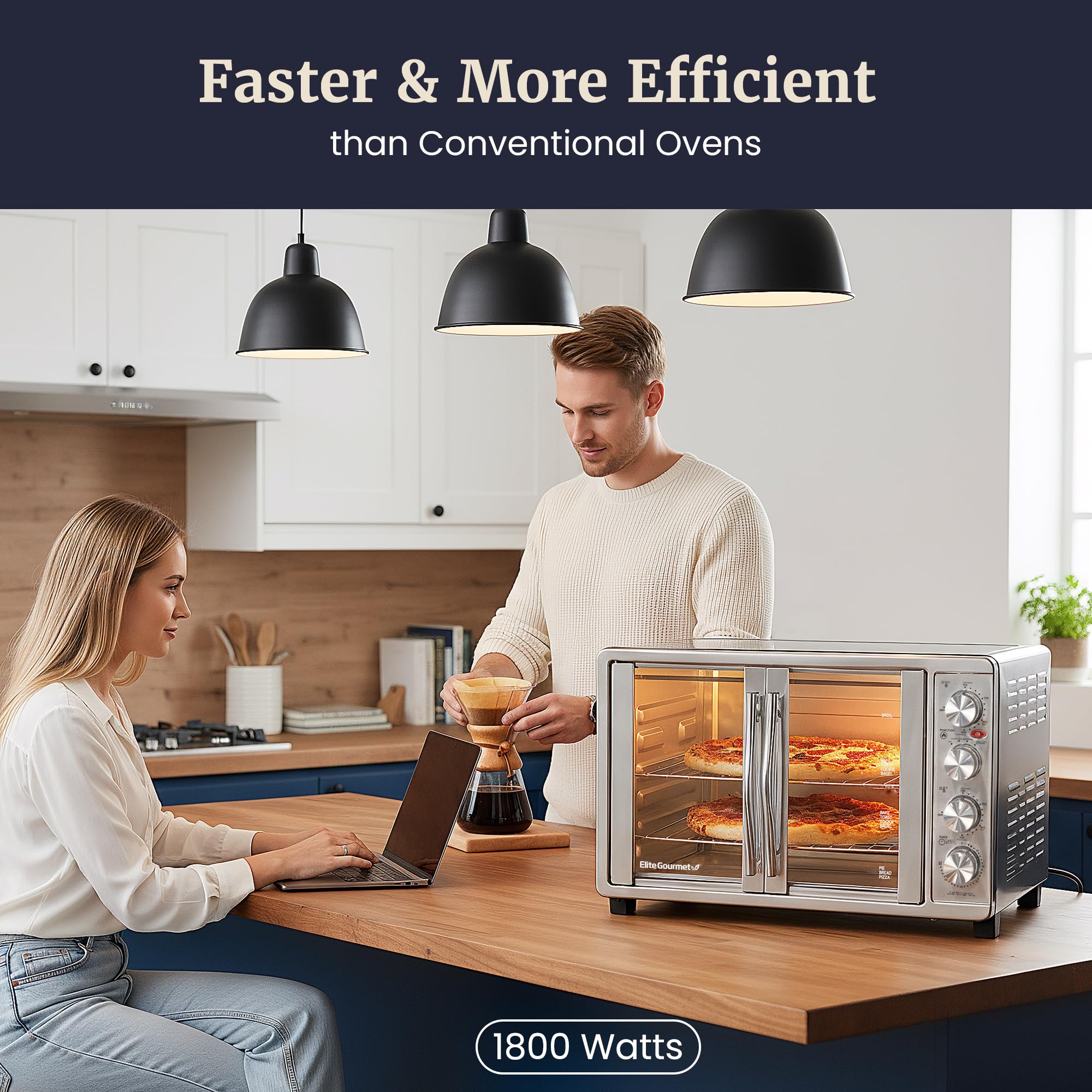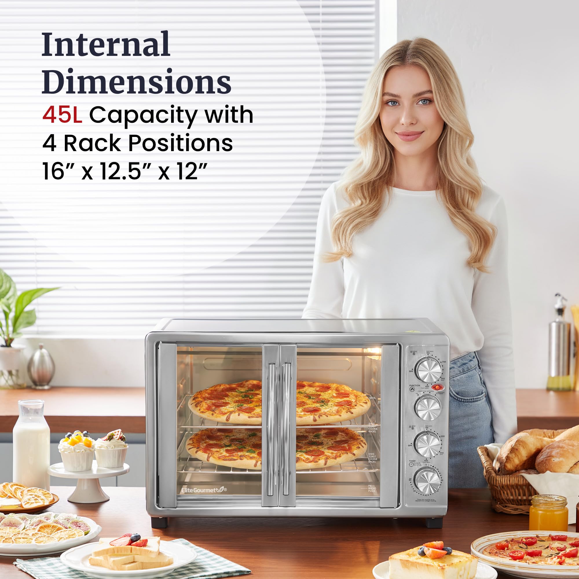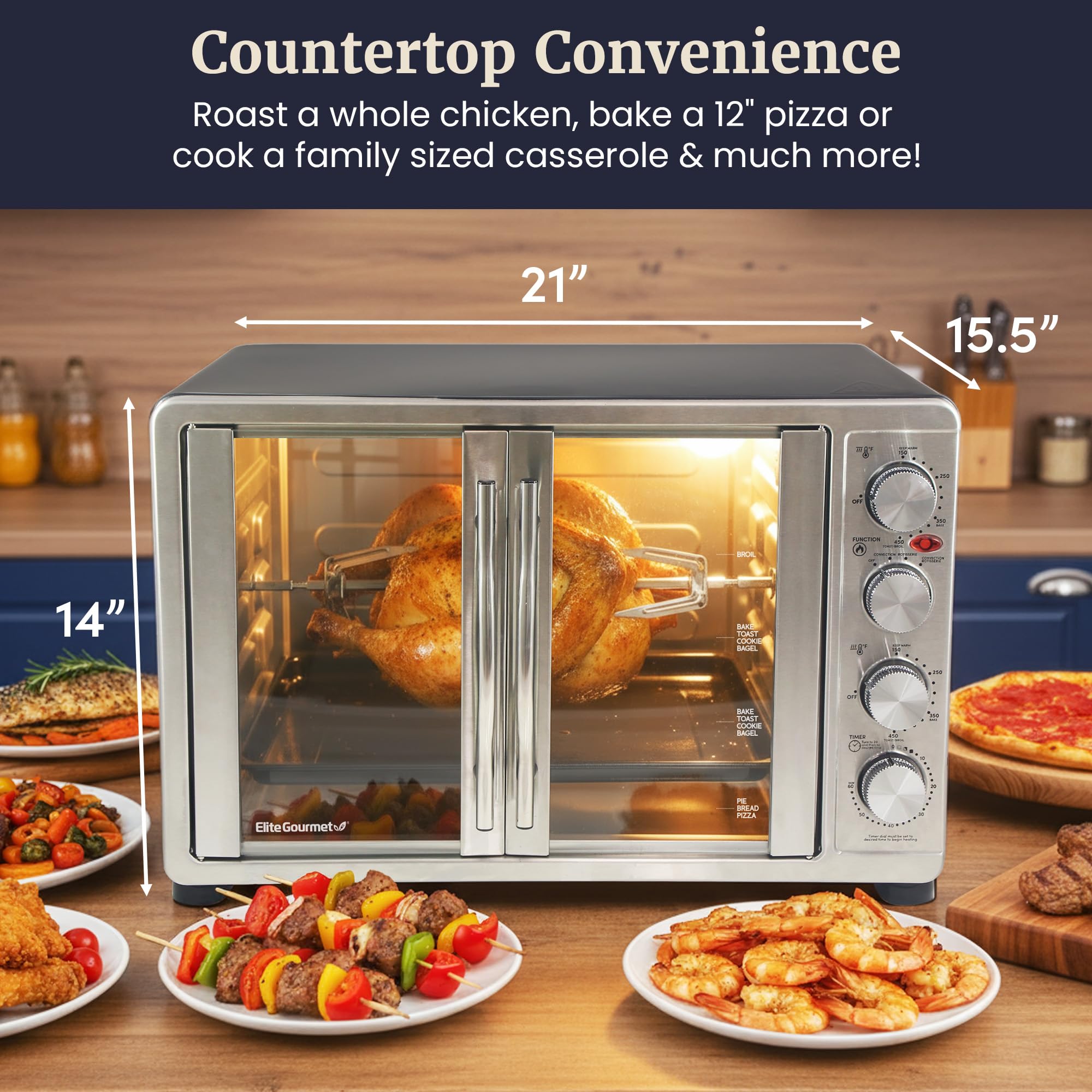 Introducing the Elite Gourmet Double Door countertop oven, The perfect stand-in or supplement to conventional ovens. This dual door Rotisserie and convection oven will have you forget about your traditional oven altogether! Toast, bake, broil, and Rotisserie your way to delicious, hearty meals and decadent desserts - this oven can do it all! The spacious interior boasts 4 rack positions so you can bake 2 x 12" Pizzas, warm dinner rolls, and broil a casserole all at the same time! With heating elements on top and bottom that can be independently turned on using the separate temperature dials, a 60-minute timer, and a function dial, This oven really has the versatility you've been waiting for. Includes French-style doors, an interior light, 2 x wire racks, 1 enamel bake tray, a tray handle, Rotisserie set and handle and a crumb tray. Removable parts are all dishwasher safe. Avoid heating up your kitchen with a big conventional oven, save time and use less energy with the Elite Gourmet Double Door countertop oven, The perfect supplement for the holidays when your kitchen needs goes on double duty!