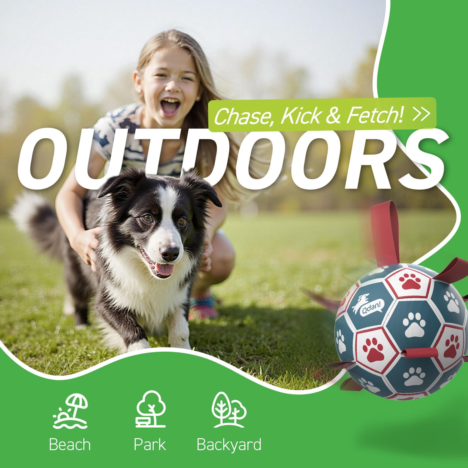 Upgrade Interactive Dog Toy: Dog soccer ball with nylon tabs sewn evenlyinto the seams not only create an erratic bounce that dogs love to chase, but also make it easier for the dogs to fetch, toss, tug and retrieve. Dog paws areprinted evenly on the dog toys ball to attract dogs attention. There's a longelstrap for people to hold onto the ball, making it a great interactive dog toy to train your dogs