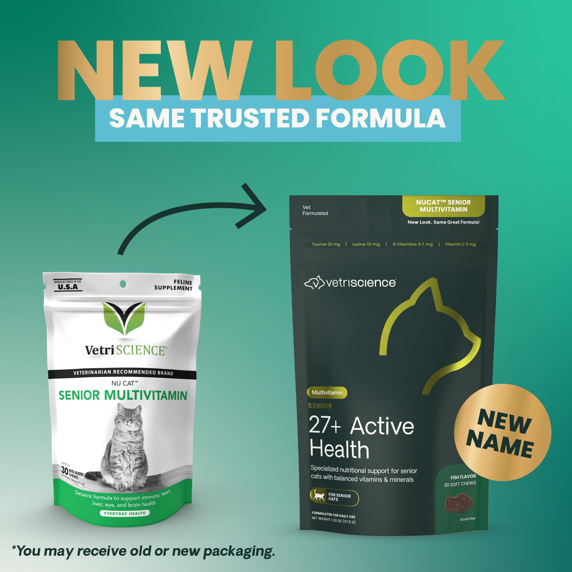 Give your cat the support they need with Senior 27+ Active Health (new name, same great NuCat Senior Multivitamin). These multivitamin chews are vet-formulated for daily health and vitality and packed with 27+ essential nutrients, including vitamins, minerals, antioxidants, and fatty acids, to help balance your senior cat's diet and fill nutritional gaps not covered by standard commercial cat food. Ideal for senior cats of all breeds and sizes, this multivitamin for senior cats supports heart, brain, immune, and joint health, while promoting healthy digestion, skin, and energy levels. It's perfect for cats on homemade or raw diets, ensuring they receive the full spectrum of nutrients needed for optimal aging. Ingredients like arginine aid immune function and detox, while Omega-3 and -6 fatty acids from fish oil support brain, eye, and joint health. Antioxidants like vitamins A, C, and E protect against free radicals, while B vitamins support cellular health, mood, and energy. Designed for senior and geriatric cats, these fish-flavored soft chews are easy to administer. Give your cat a daily boost with this comprehensive senior cat multivitamin to keep them happy, healthy, and thriving in their golden years. Our dog and cat supplements are certified by the National Animal Supplement Council (NASC), routinely undergo third-party testing, and contain no hidden ingredients, artificial flavors, synthetic colors or preservatives.