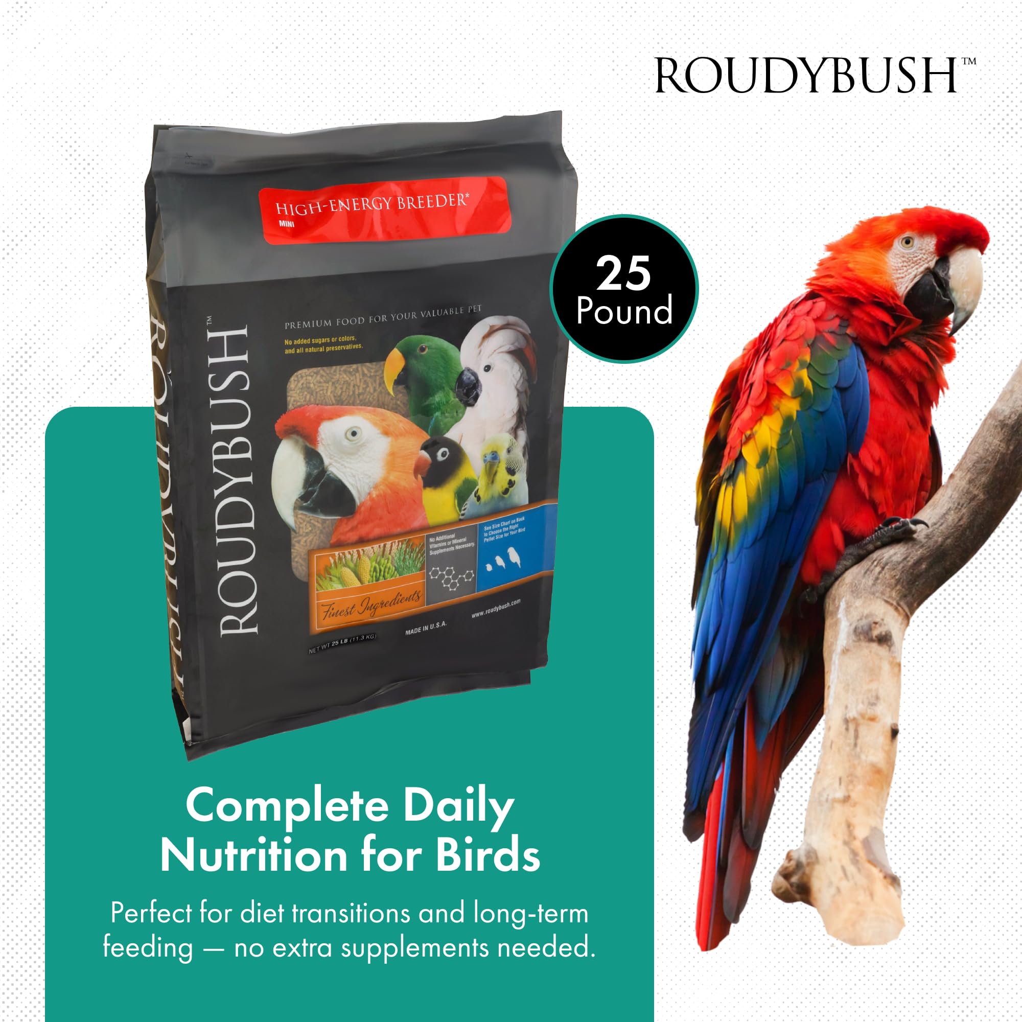 Roudybush High Energy Breeder Food for Breeding & Weaning Birds - Scientifically Formulated Bird Feed - Bird Food Pellets w/ Corn, Wheat, Soy & More - Nutritious & Healthy Feed for Birds (Mini, 25lb)