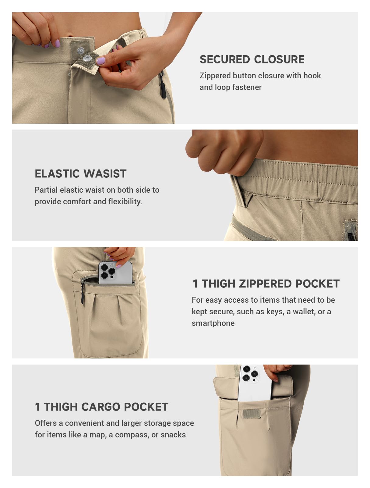 Functional Pocket: 5 secure pockets, including zippered side, thigh, and rear pockets, provide ample storage for essentials like compasses and snacks