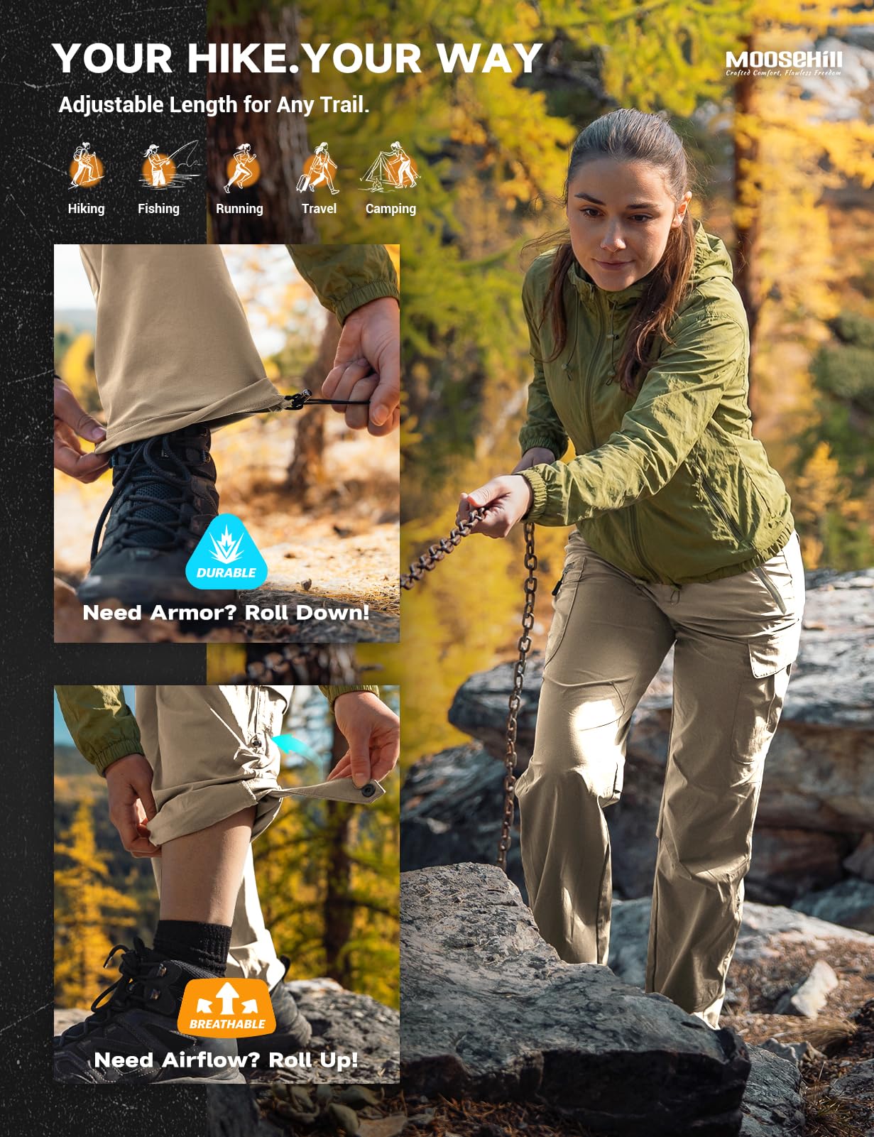 All-Condition Fabric: Our hiking pants feature quick-drying, breathable, and water-resistant fabric, offering sun protection and durability for a comfortable outdoor experience