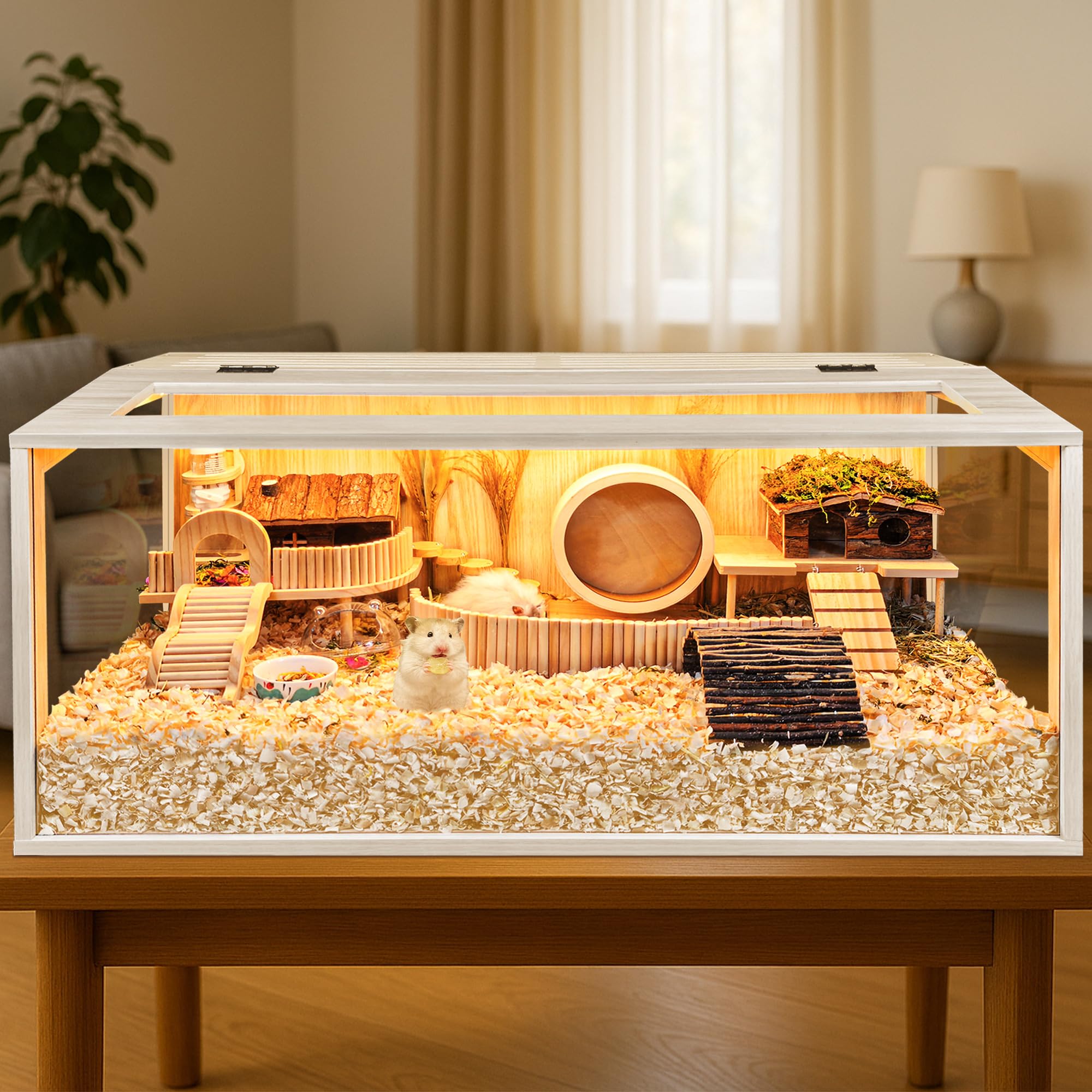 【Thick Bedding Matters】Research shows it’s best to have plenty of bedding so your hamsters can make a burrow just like they would in the wild. The extreme large interactive space of our cage is able to hold thick bedding and toy system for your pets to dig and explore. It's easy to arrange their hideout, sand bath area, hamster wheel, or exploring scene in the cage, which results in a far happier and less stressed hamster compare to the wire cage. We offer 4 different sizes, feel free to choose from 24-48in length. Note: The inner decoration is not included in the package