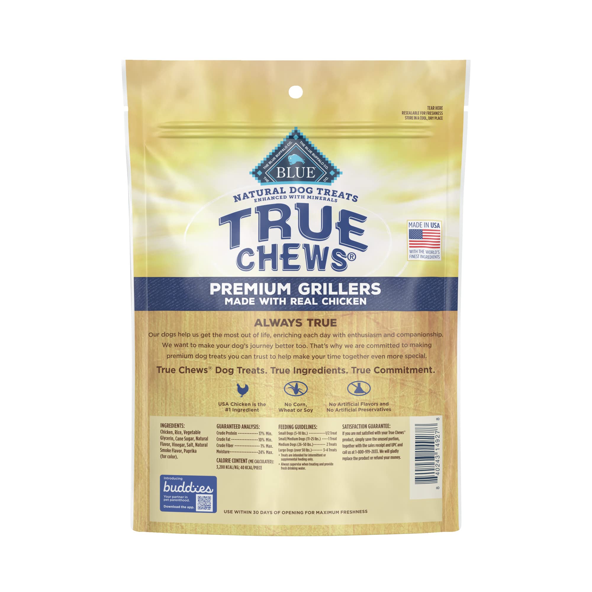 Contains: One (1) 12-oz bag of BLUE True Chews Natural Premium Grillers Dog Treats, Chicken Recipe