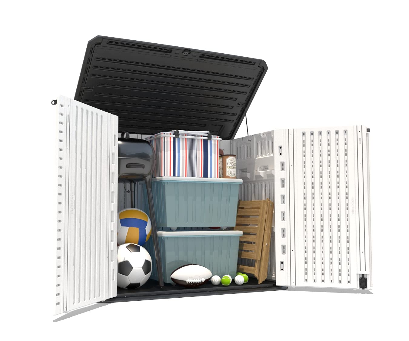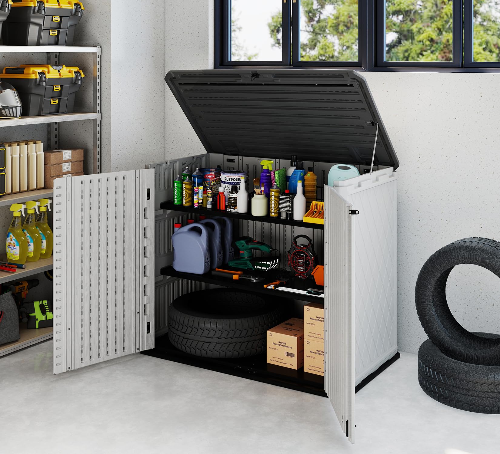 【Weather Resistant】This outdoor storage cabinet is made of double-layer resin sheet which is treated with blow molding technology to provide stronger wind and impact resistance, not easy to bend or puncture, the resin material is highly weather resistant, it can be used in all-weather and it is also easy to clean and maintain, suitable for outdoor use all year round.