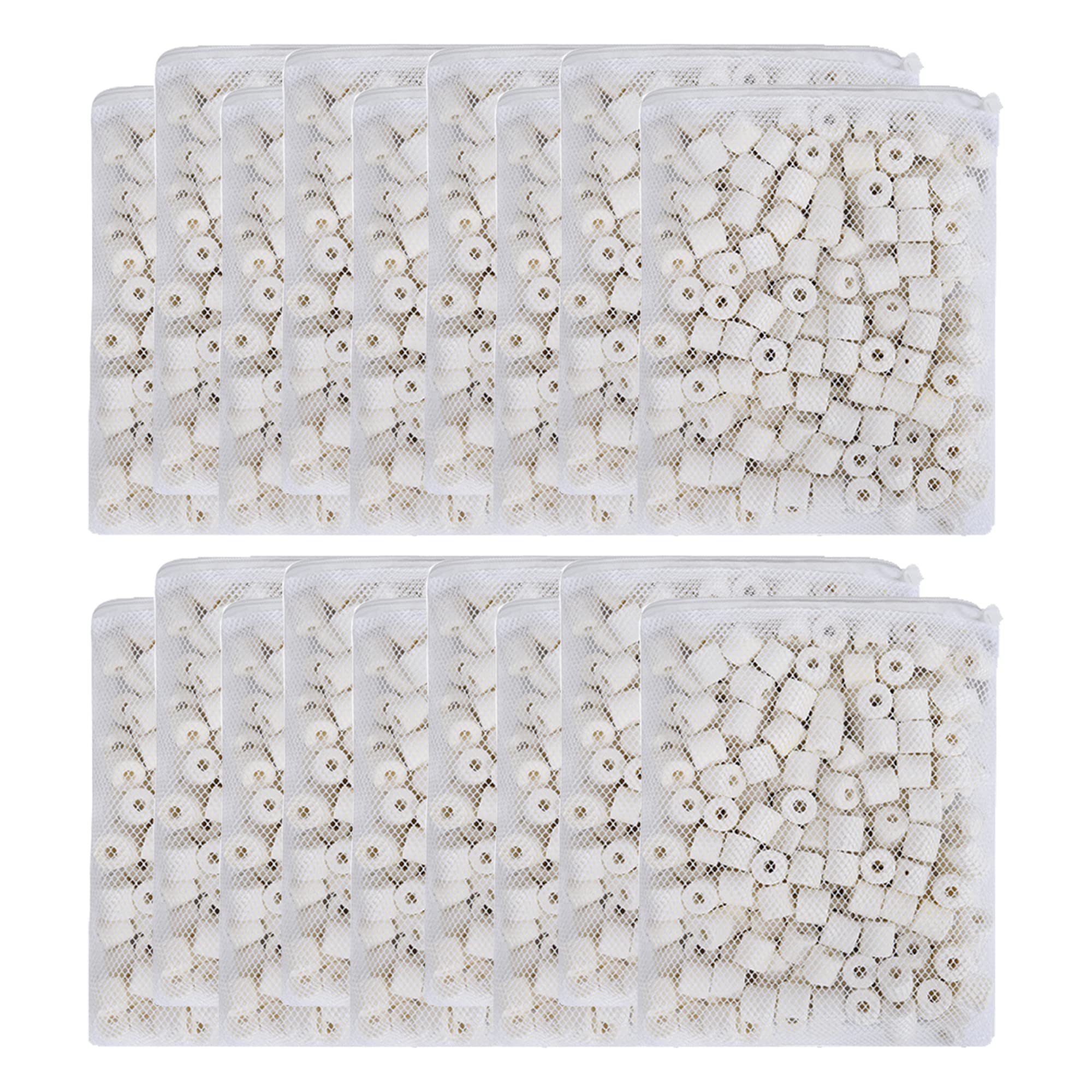 18 lbs wiht 18 mesh bags. Size of ceramic ring: 1/2" x 1/2".