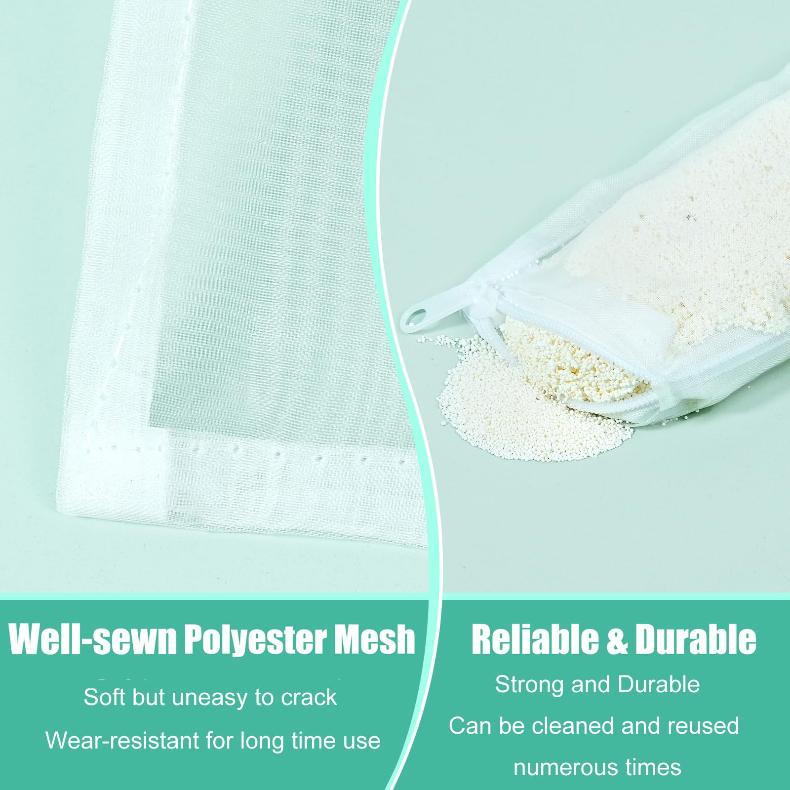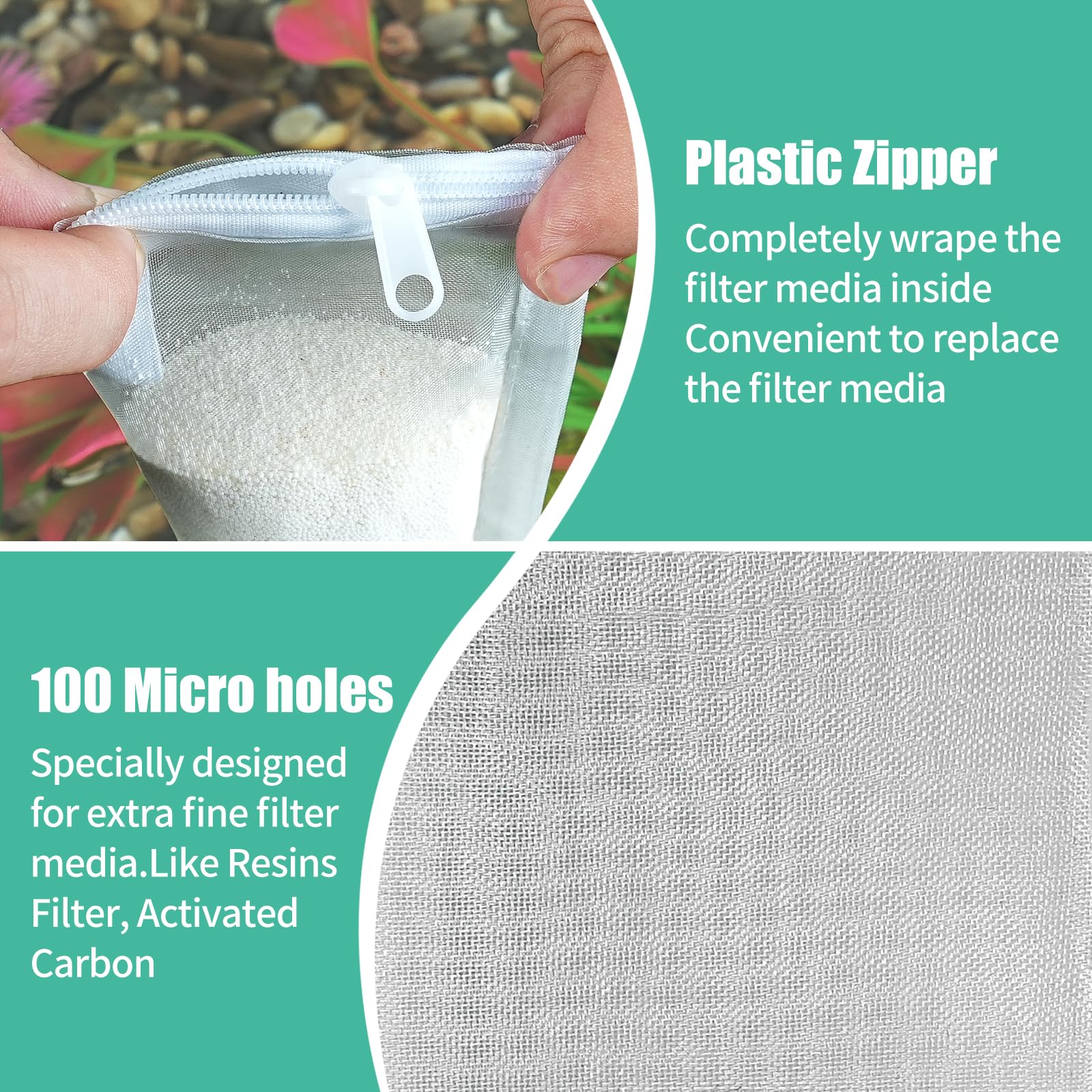 These unique mesh filter bags are easy to fill and empty with top zipper design to keep filter media secure. Our bags are durable, washable, and can be reused.