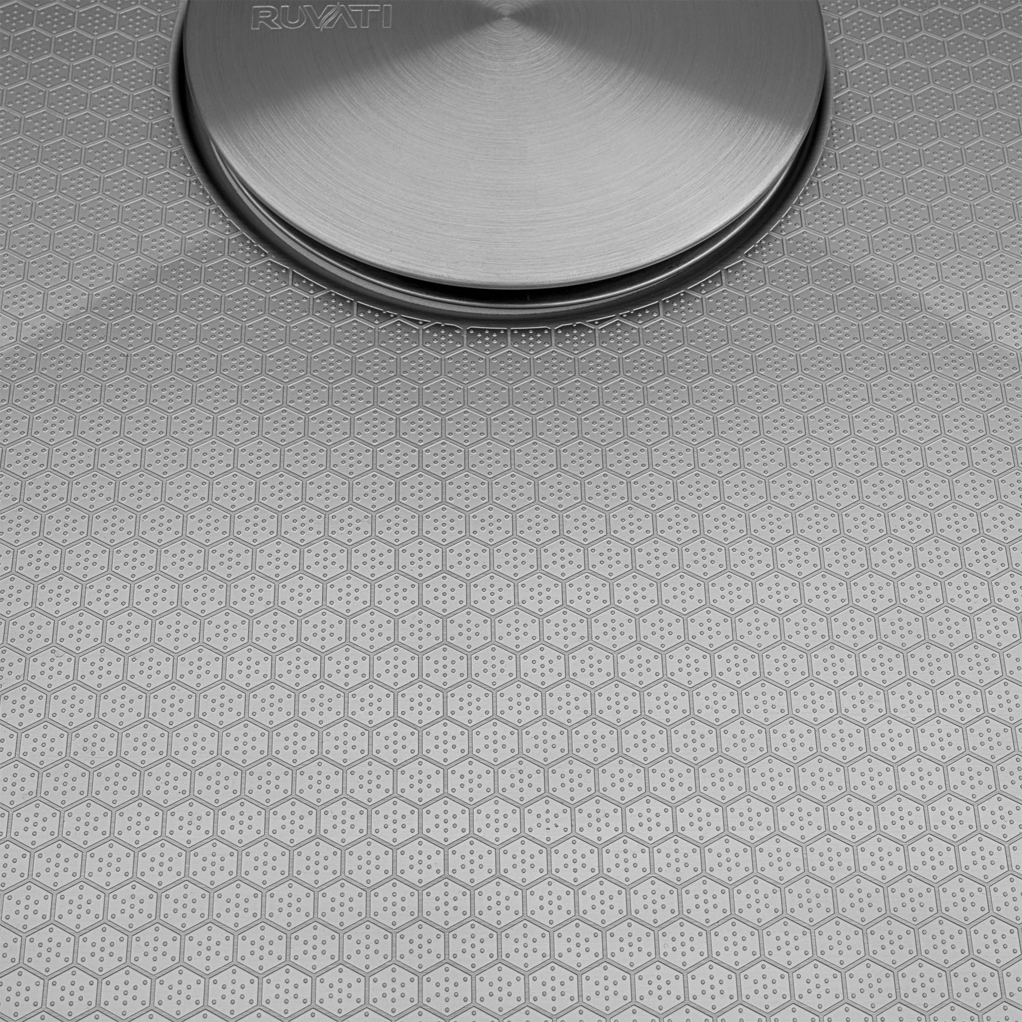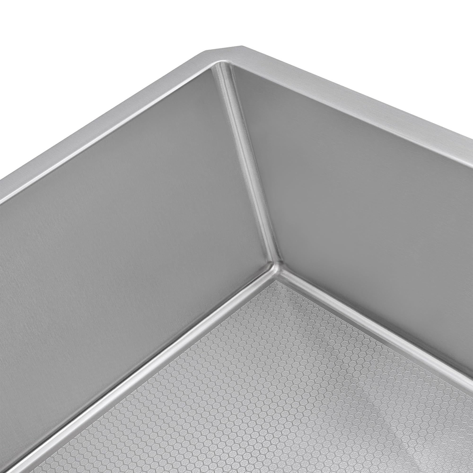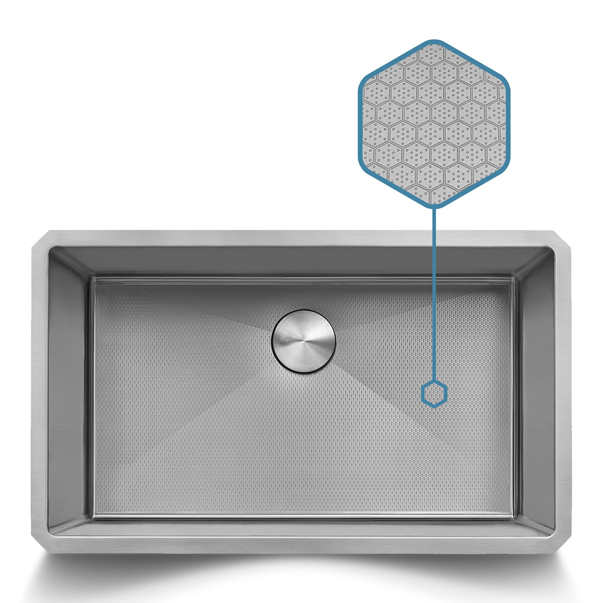 16 GAUGE STAINLESS STEEL: Premium T-304 Grade (18/10 Chromium/Nickel) ensures durability and resistance to rust and stains. | PATENT-PENDING HEXBOTTOM TECHNOLOGY: Features a hexagonal pattern with a matte finish for a semi-reflective, modern look. | NO PROTECTIVE BOTTOM GRID NEEDED: Textured bottom minimizes contact points, protecting the sink from scratches and wear.
