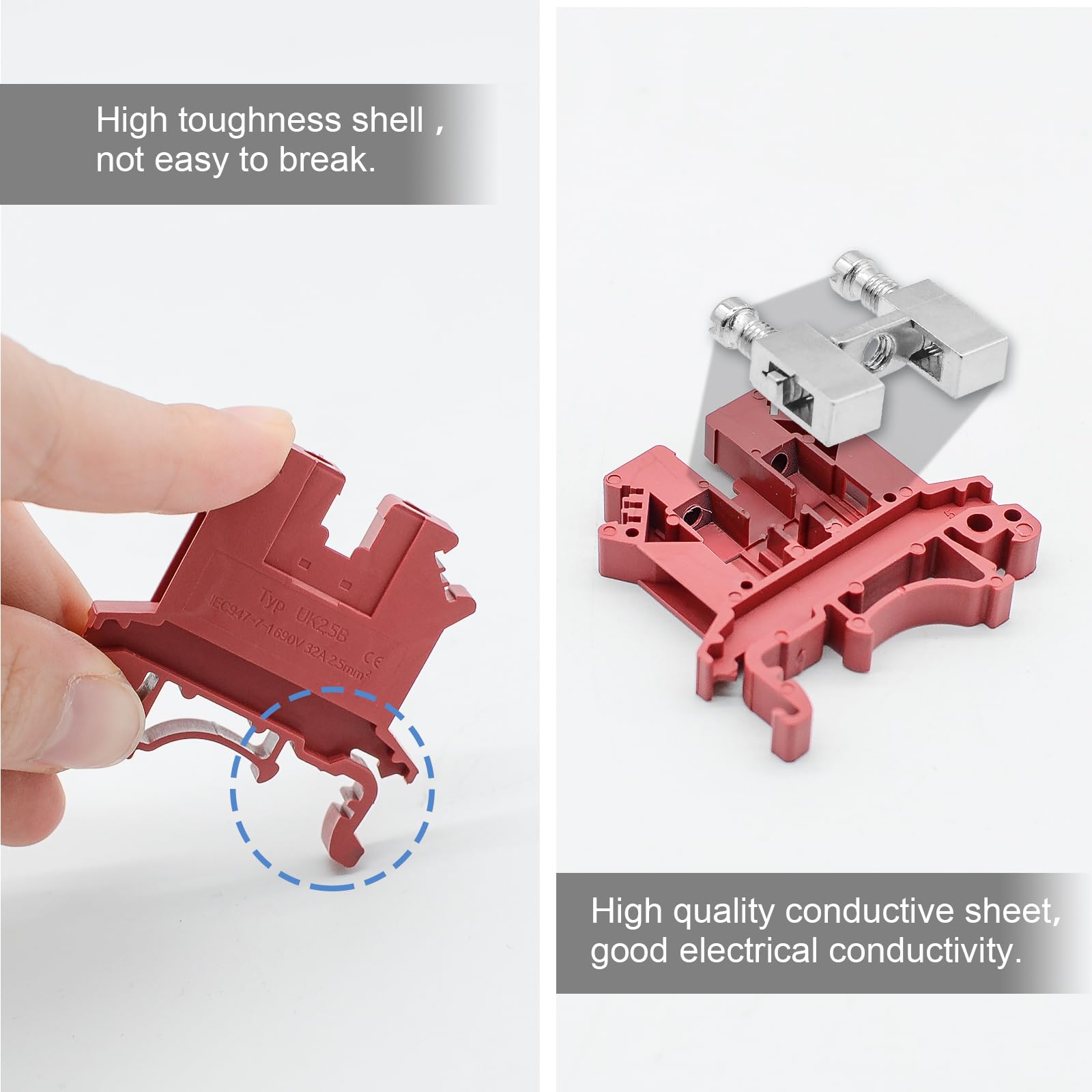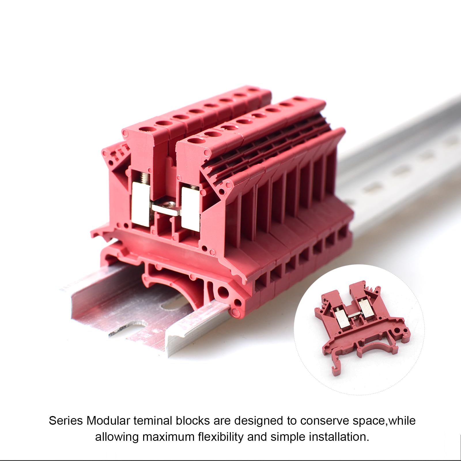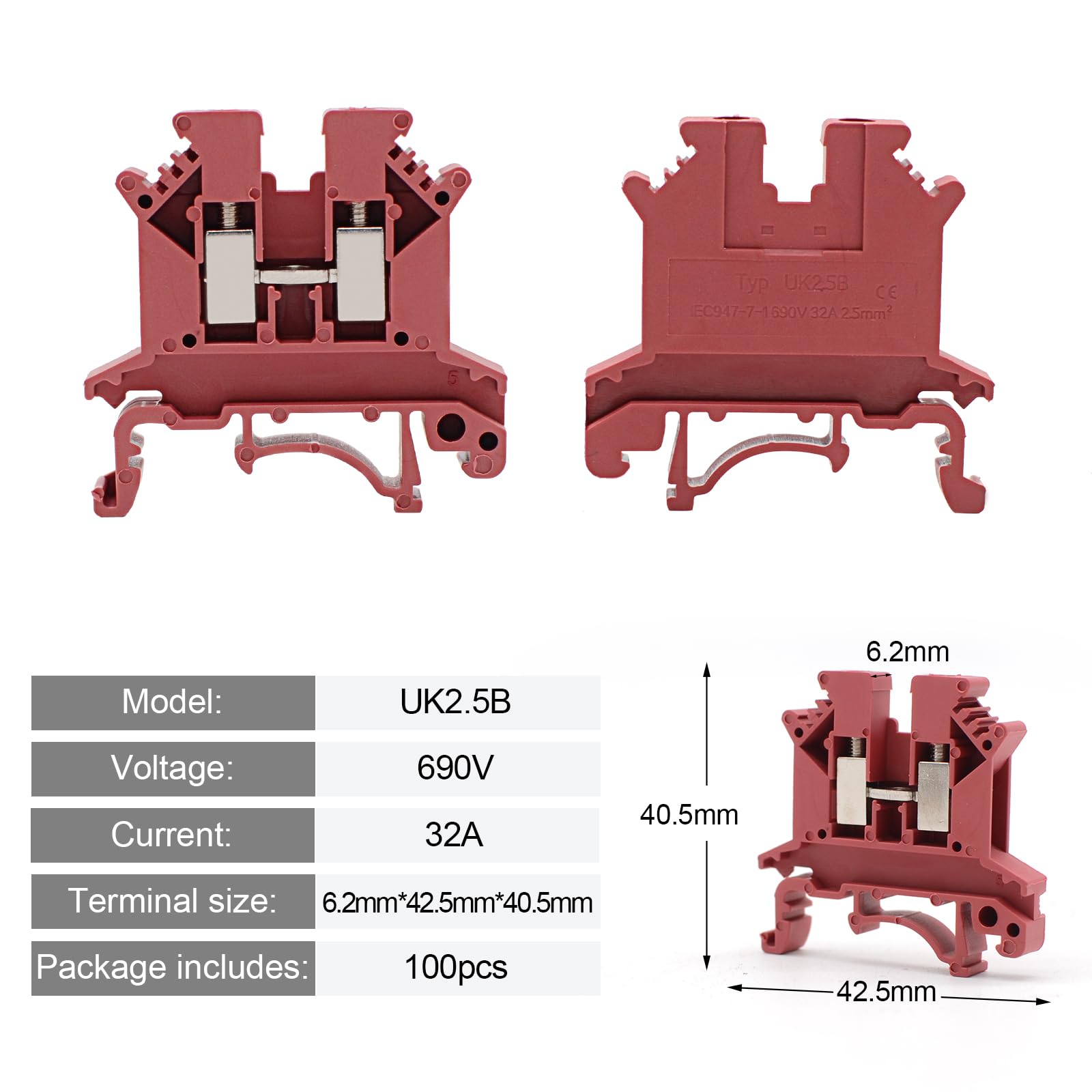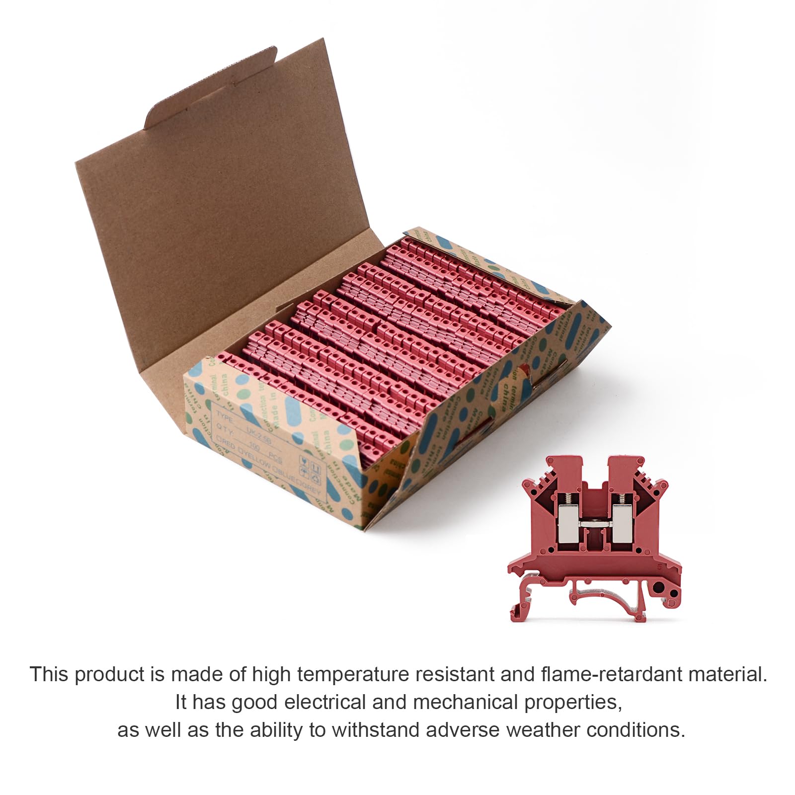 Description: The product is made of high-quality insulating materials and pure copper, which is flexible and convenient to use, and can ensure the personal safety of operators. Also it has a wide range of applications that can greatly meet your needs. Features: High quality materials can resist bad weather. The conductive sheet is made of pure copper with strong electrical conductivity. The reasonable design structure makes the operation convenient and also ensures the personal safety of the staff. Wide application range can greatly meet your needs. Specification: Material:High quality insulating materials and pure copper conductive sheet. Colour:Red Model:UK-2.5B Current:32A Voltage:690V Terminal size:6.2*42.5*40.5 mm Package:100 pack