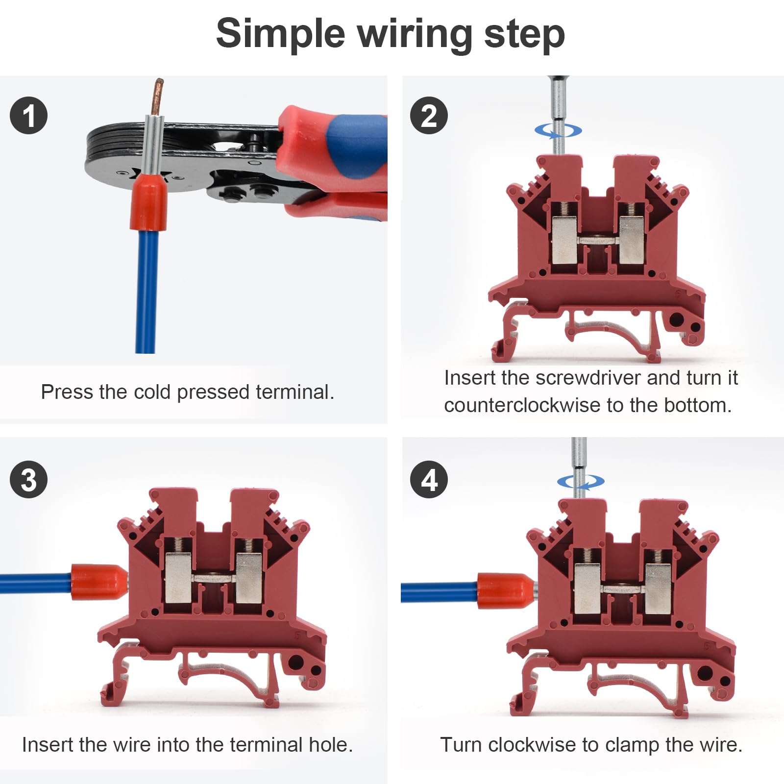 Wiring Mode: Strip the insulation layer of the wire with wire stripper, insert the cold pressed terminal, press the cold pressed terminal with wire crimper insert a slotted screwdriver and rotate it anticlockwise to rotate the wire crimping frame to the bottom, insert the wire into the depth of the terminal hole, rotate it clockwise to clamp the wire, and then take out the screwdriver