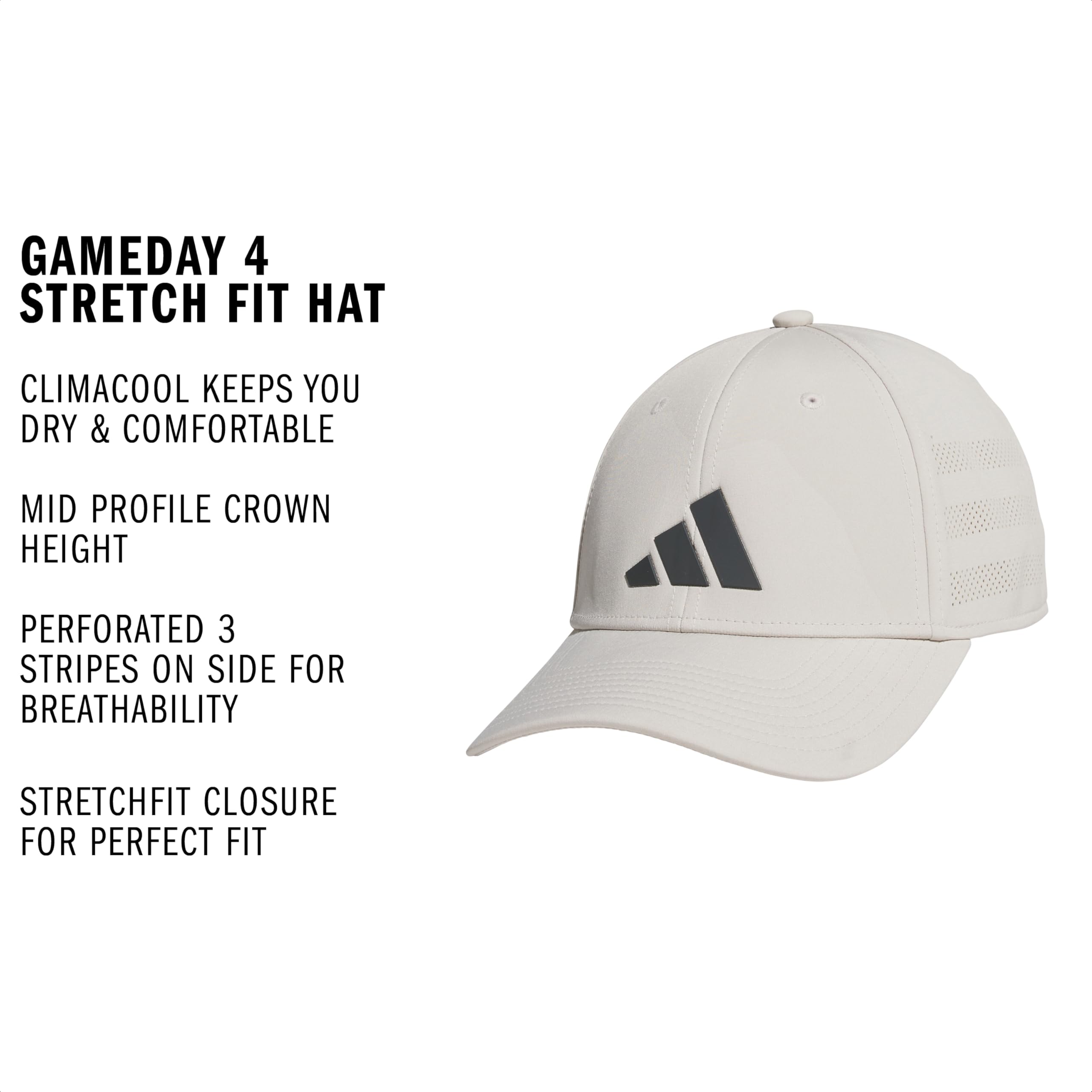 Description The adidas Men's Gameday Structured Stretch Fit Hat is the ideal choice for those seeking versatile mens hats and caps. Designed as a great hat for men, this flexible athletic sports cap offers both style and function. Made from durable poly spandex material, it withstands wear and tear while maintaining its sleek look. Ideal for various activities, whether you're searching for golf hats that men appreciate or looking for that perfect running hat men need, this cap has it all. As a great choice among men's baseball caps, the cap features a snug, stretch fit that adjusts effortlessly. The perforated 3-stripes on the sides provide breathability, making it a great pick as a men's baseball cap. With UPF 50 protection, it effectively blocks harmful UV rays, allowing you to focus on the game. This cap dries fast, keeping you cool and comfortable whether you're on the sidelines or in the heat of a practice session. Elevate your collection of men's hats with this stylish cap.