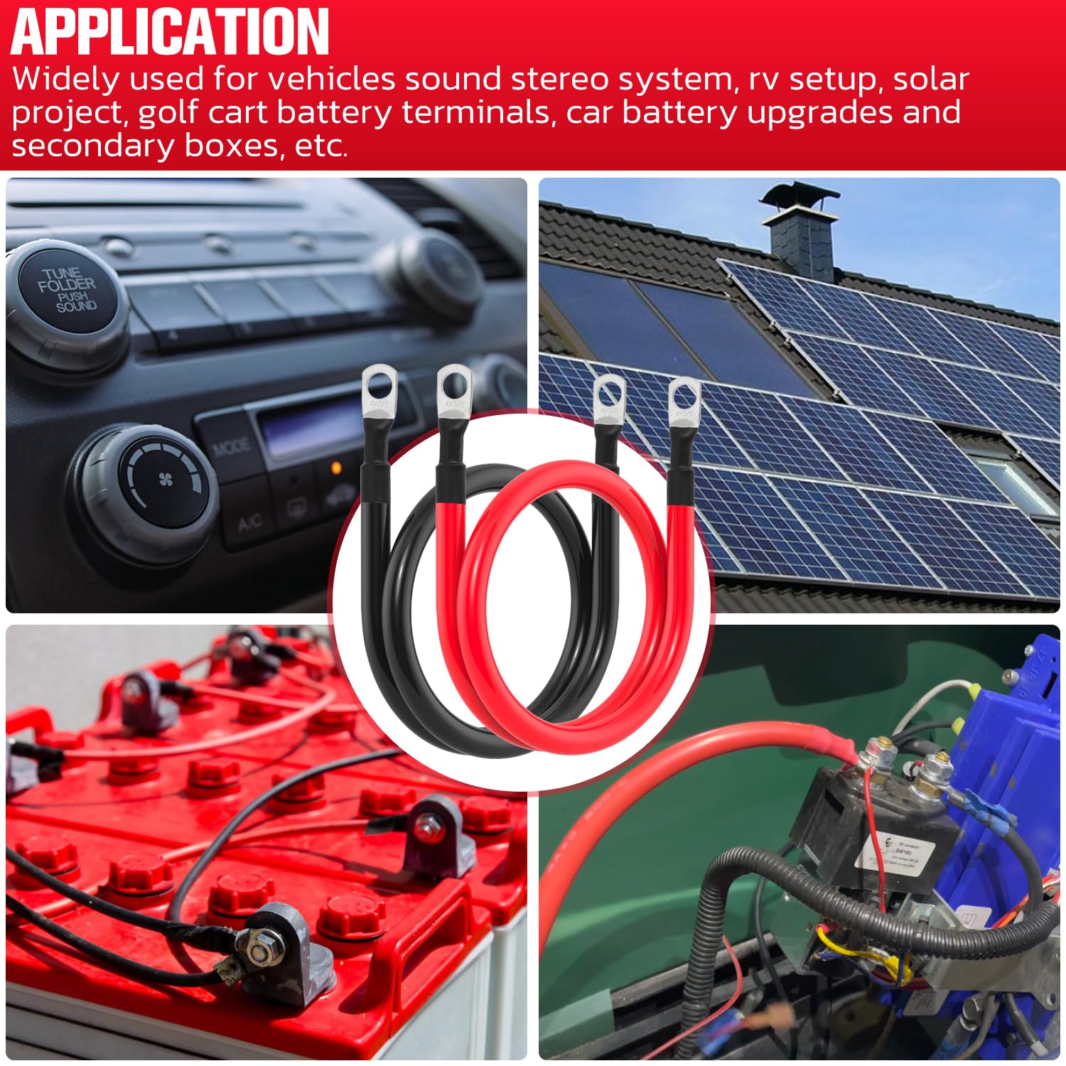 You can use these battery cables for replacement automotive, motorcycle, RV, camper, travel trailer and other vehicle wiring applications, grounding cables, golf carts, car audio stereo amplifiers, solar and many other DC applications Package included: 1 black+1 red cable Note: Please carefully chack all the product information to make sure this will fit your original unit Any questions, please tell us, we’ll answer you as quick as possible
