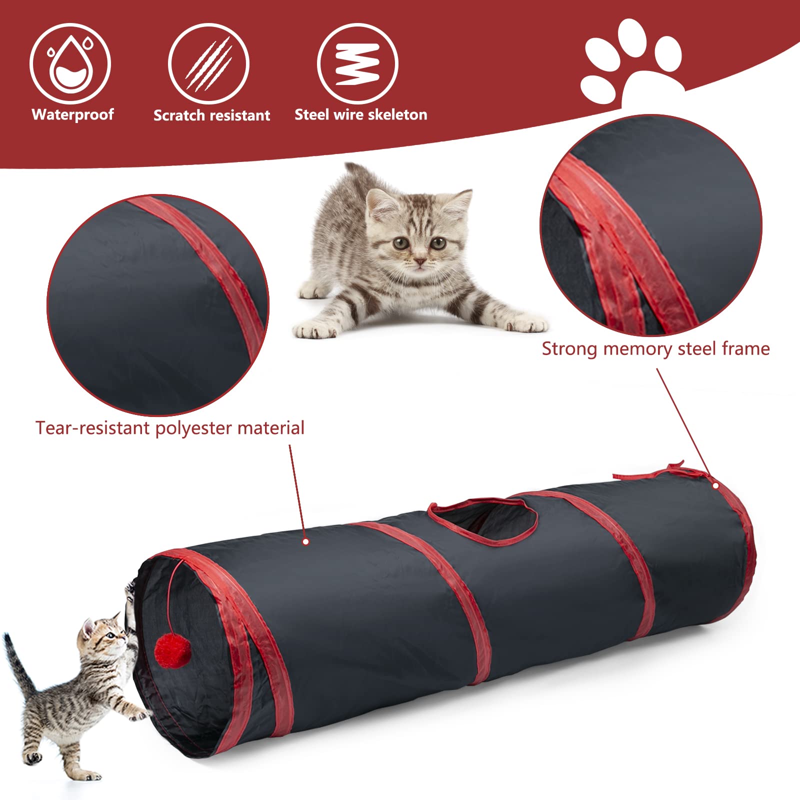 🐱【THINGS to NOTE】Due to the use of flexible steel wire support, if your pet likes to bite or tear the tunnel, please stop it in time to prevent the steel wire from being exposed and hurting the pet.If you have any questions about the product, please contact us in time.