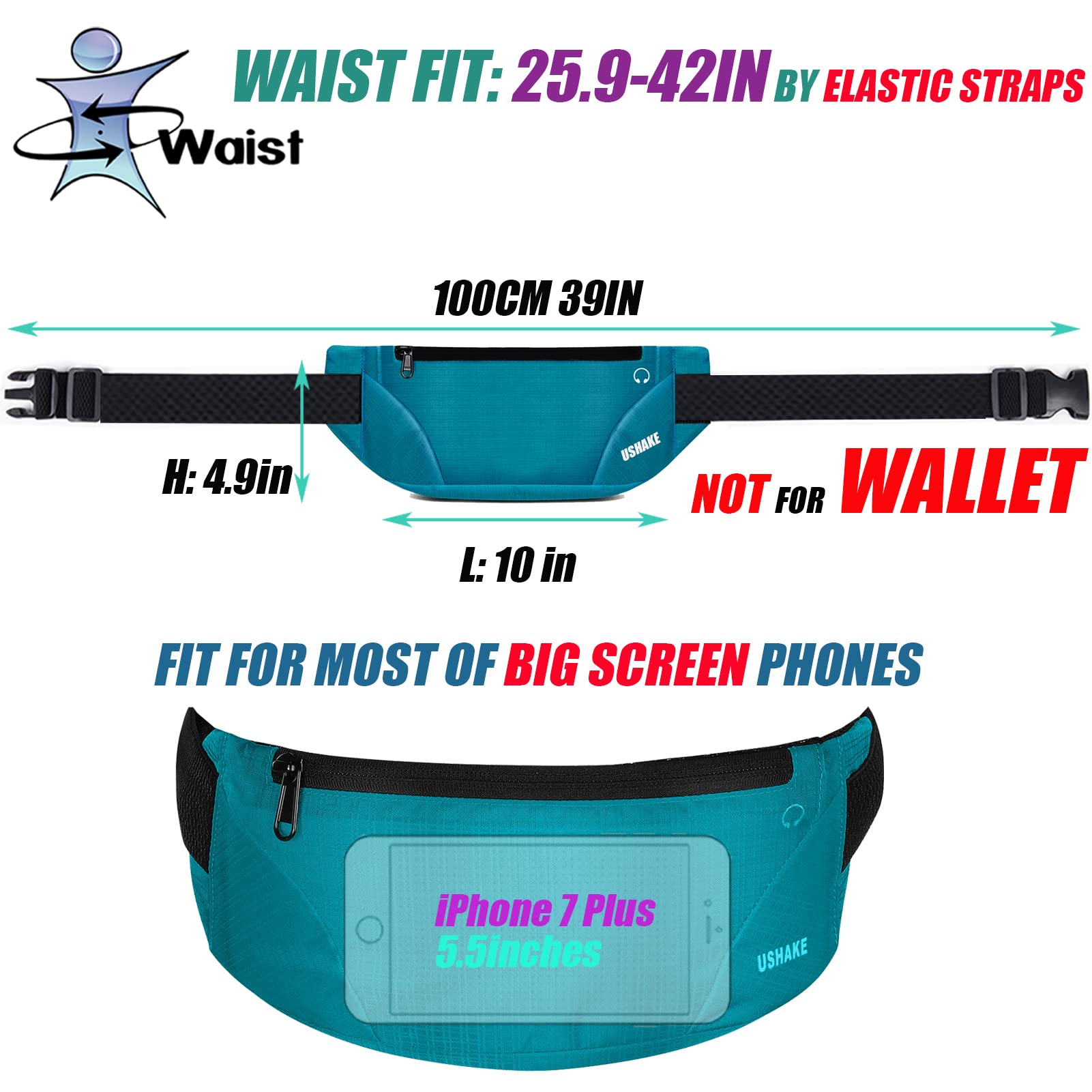 【FIT FOR DIFFERENT WAIST SIZES】: Fits 25.9 - 42 inches waists with fully adjustable elastic strap phone workout holder. Strong adjustable elastic waistband ensures it bounce free. Dimension size: 4.90"x 10.00" (HxL)