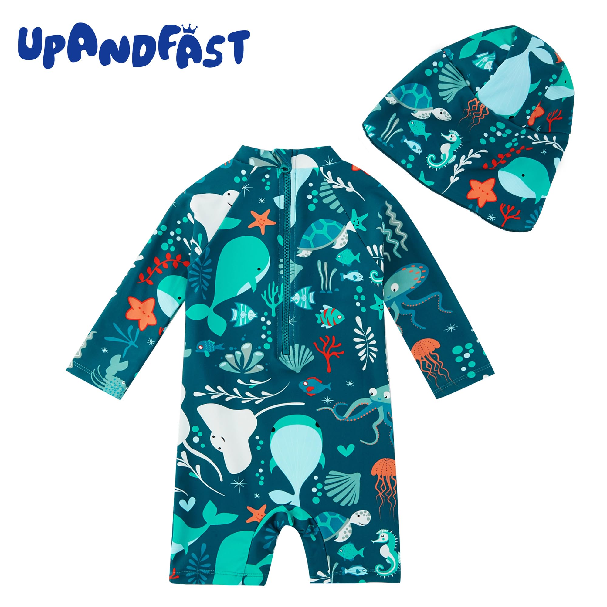 HUMANIZATION DESIGN: This one-piece baby bathing suit has a front / back zip for convenient putting on and taking off. Zipper flap and garage protect your baby's delicate skin