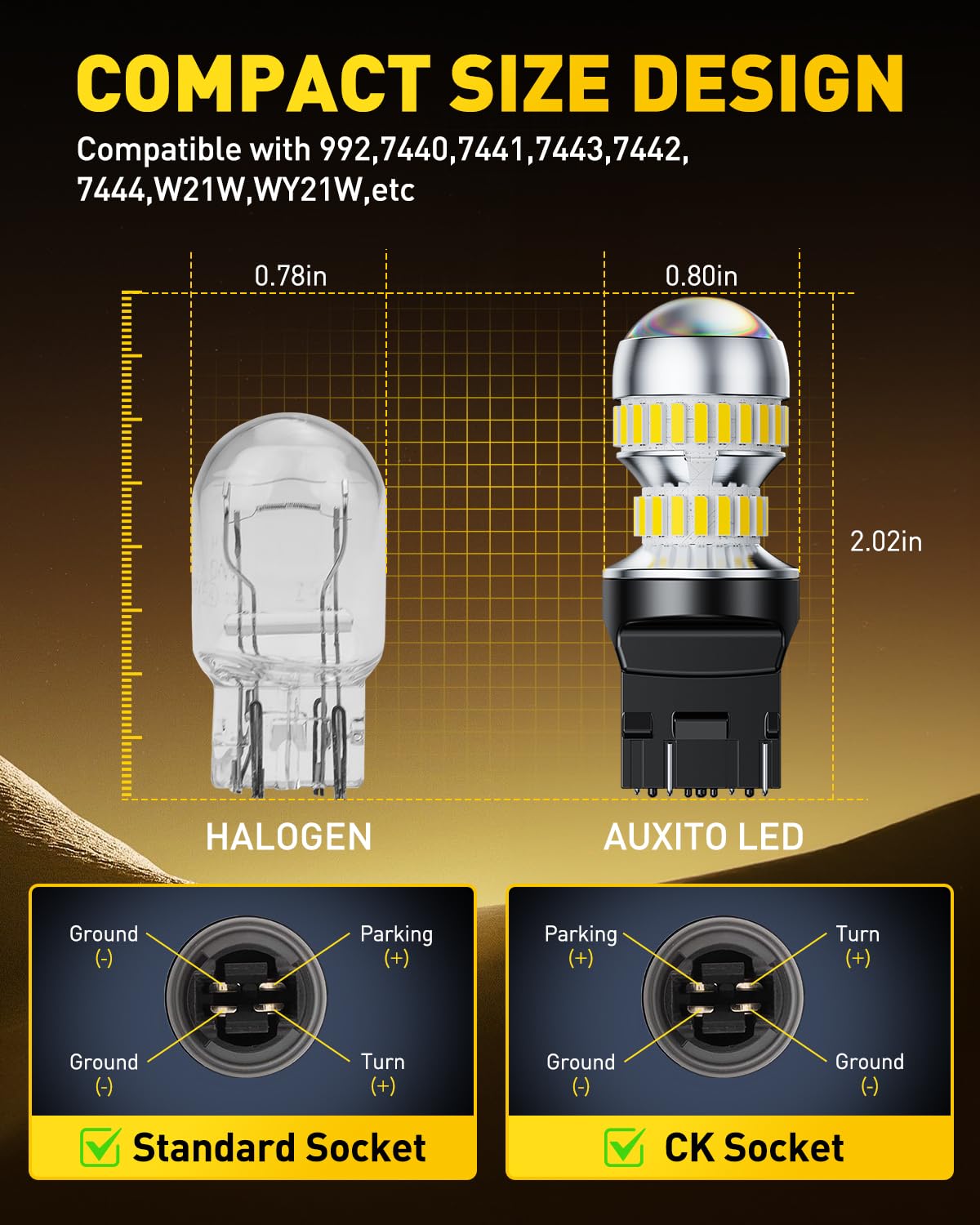 Strictly compatible with 7443 socket, non-polarity, applied to US standard and CK sockets, no modification to the original car wiring or additional decoder required. Just pull out the old bulb and insert it directly. It directly compatible with 992, 7440, 7441, 7443, 7442, 7444, W21W, WY21W, 7440NA, 7440NAK, 7444NA,7444NAK, 7443LL, etc, and can be used for reverse backup bulb, daytime running light bulb, turn signal bulb, side marker light bulb, blinker light bulb, parking lights, tail lights, brake lights, etc, with almost zero installation threshold.
