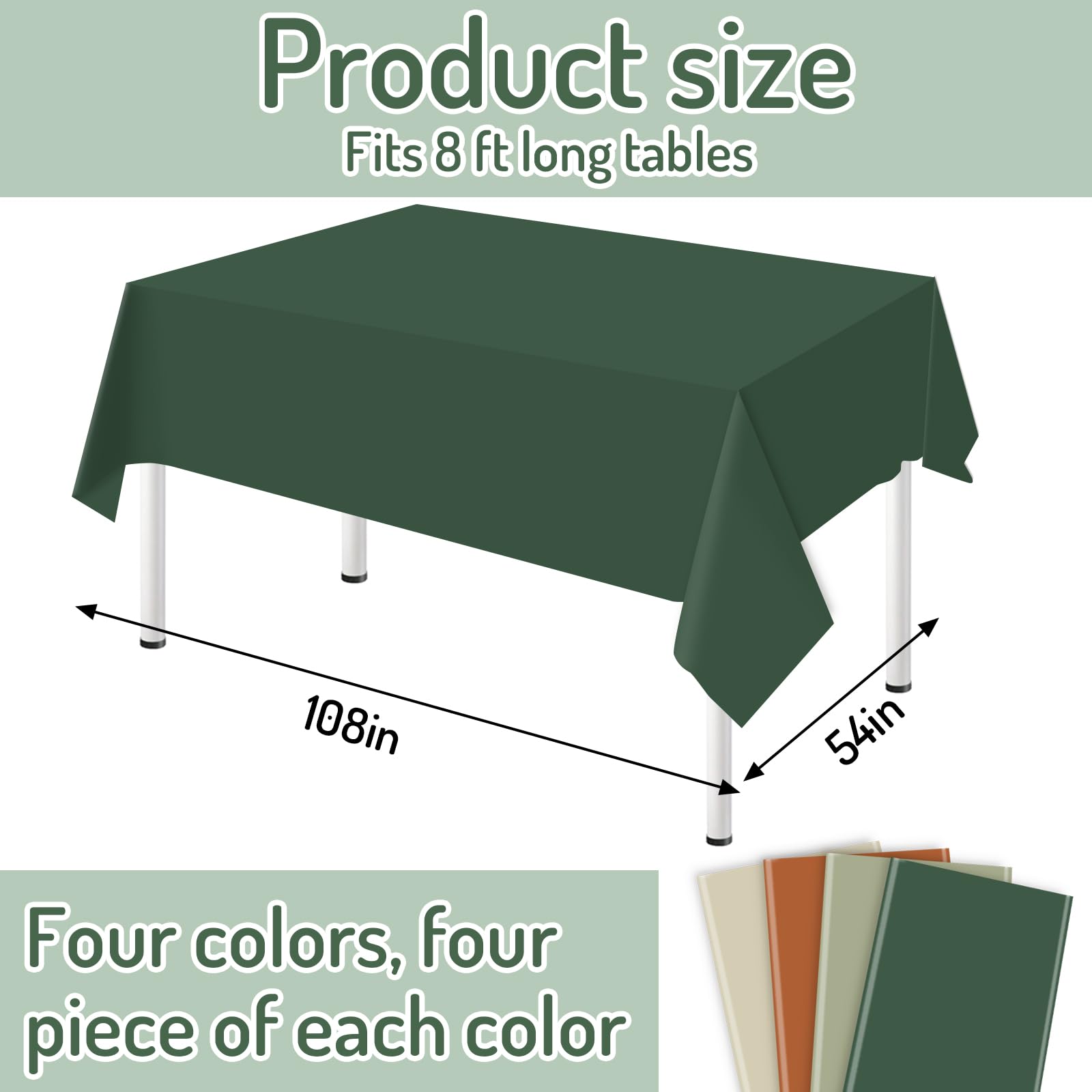 Package Includes: The package comes with 16 pcs tablecloths, and they have 4 colors, each color 4 pcs, sufficient for decoration
