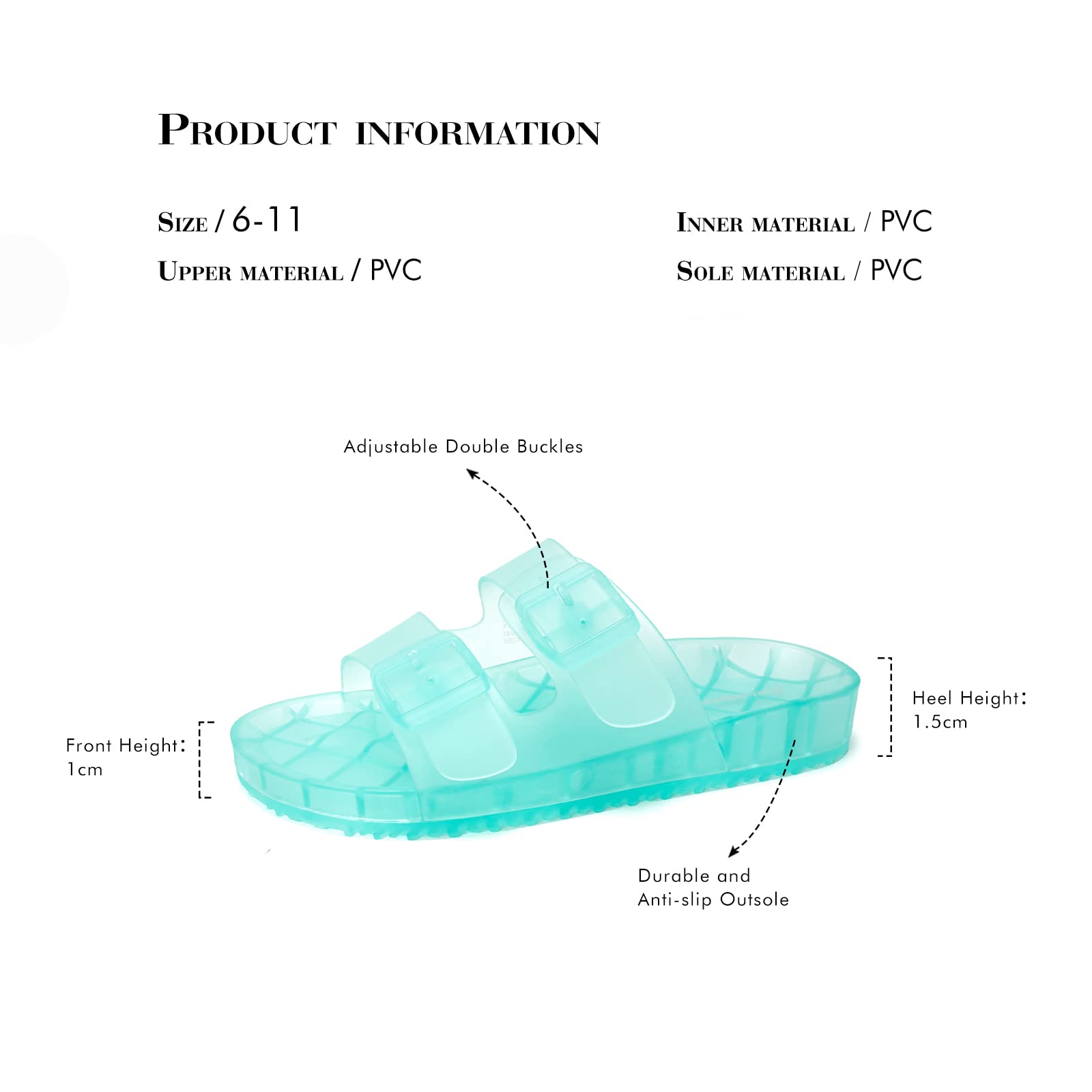 【Shoes material】The sandals are made of PVC. Due to the nature of the material itself, they may become hard over time. The sole has a wavy pattern, which is durable and anti-slip.