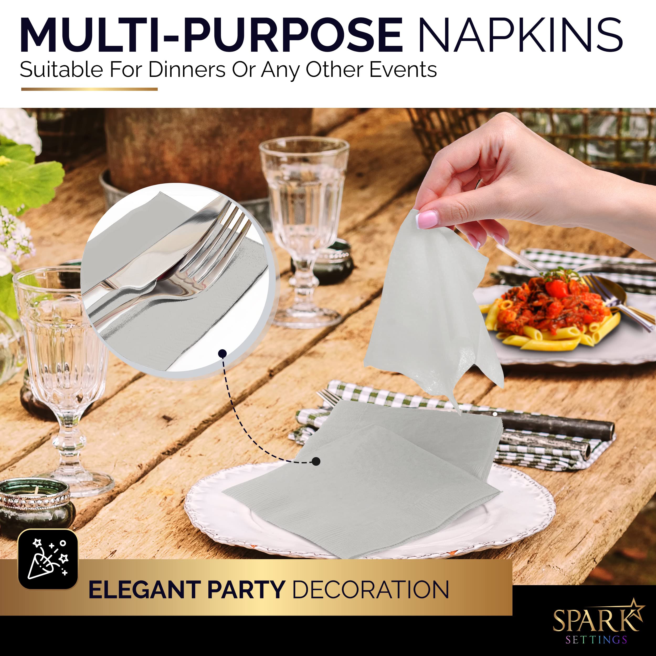 ✓QUALITY – Square napkins for wedding reception are made with high-quality soft and skin-friendly paper material which is durable has good water absorption ability and is disposable. Paper napkins disposable are an inexpensive way to protect your table surface from stains.
