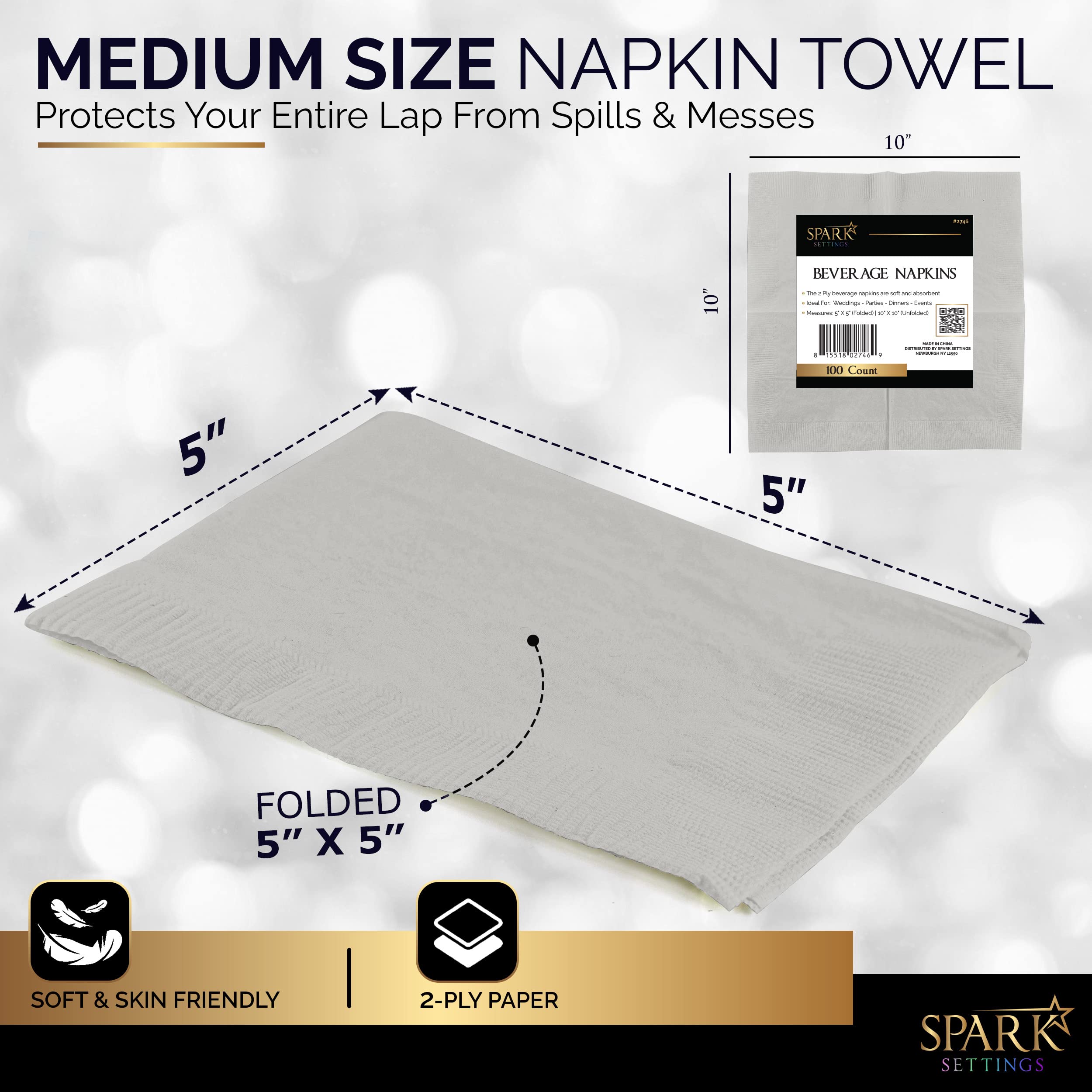 ✓SPECS - Paper cocktail napkins are disposable 2-ply dessert napkins. Paper napkins everyday have bright and vibrant colors black orange clear lime purple white blue green red pink gold burgundy and Silver. Lunch napkins are folded 5” x 5” and unfolded 10” x 10” comes in 100 pack and serve with any beverage.