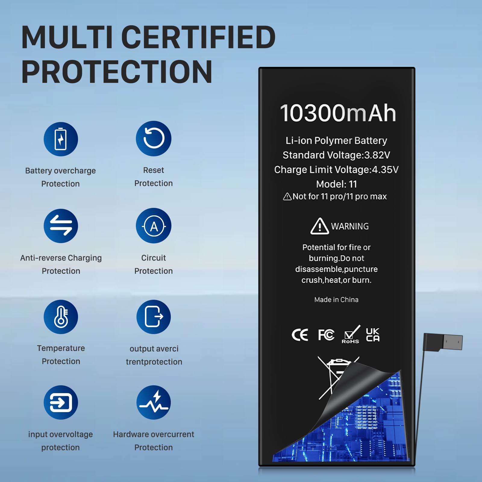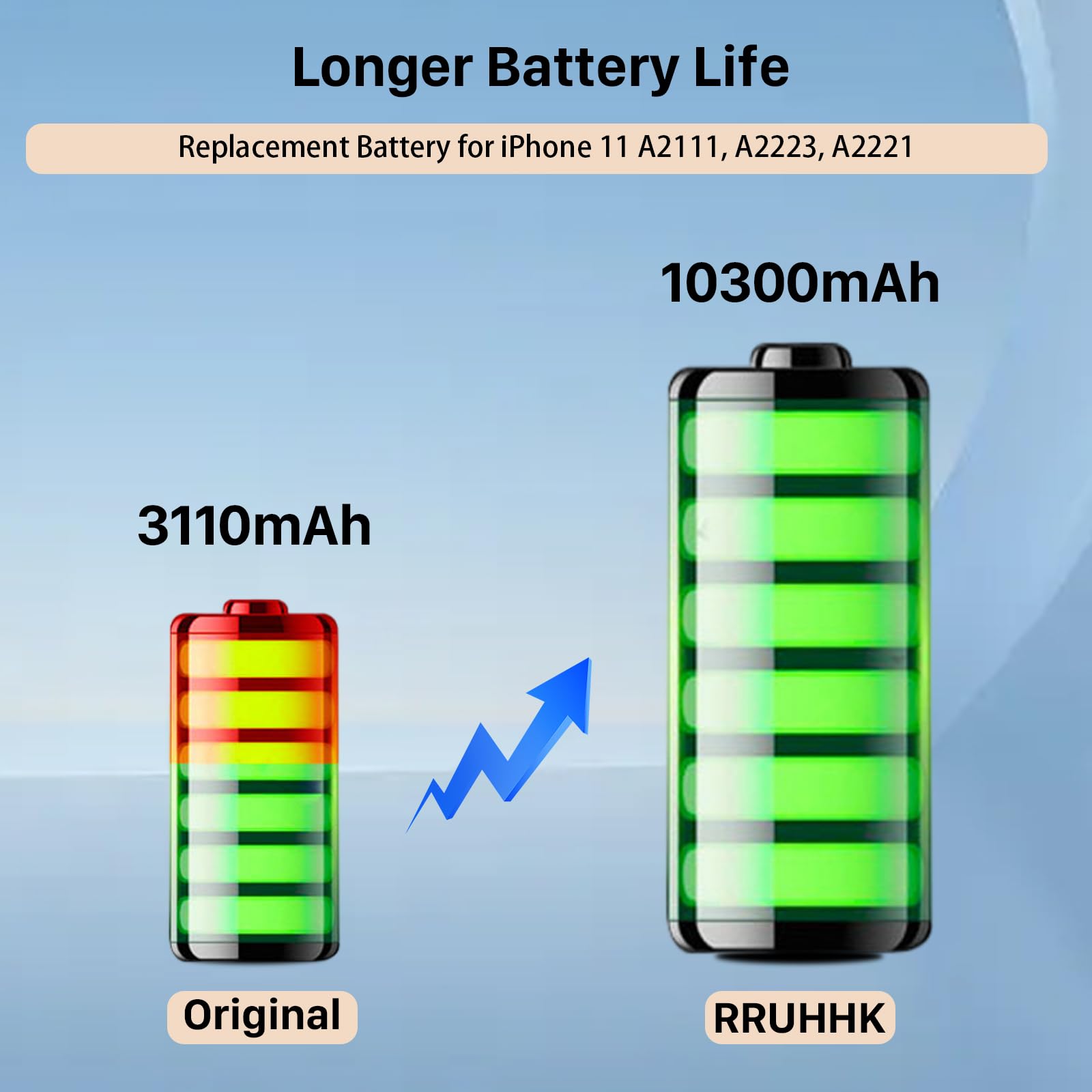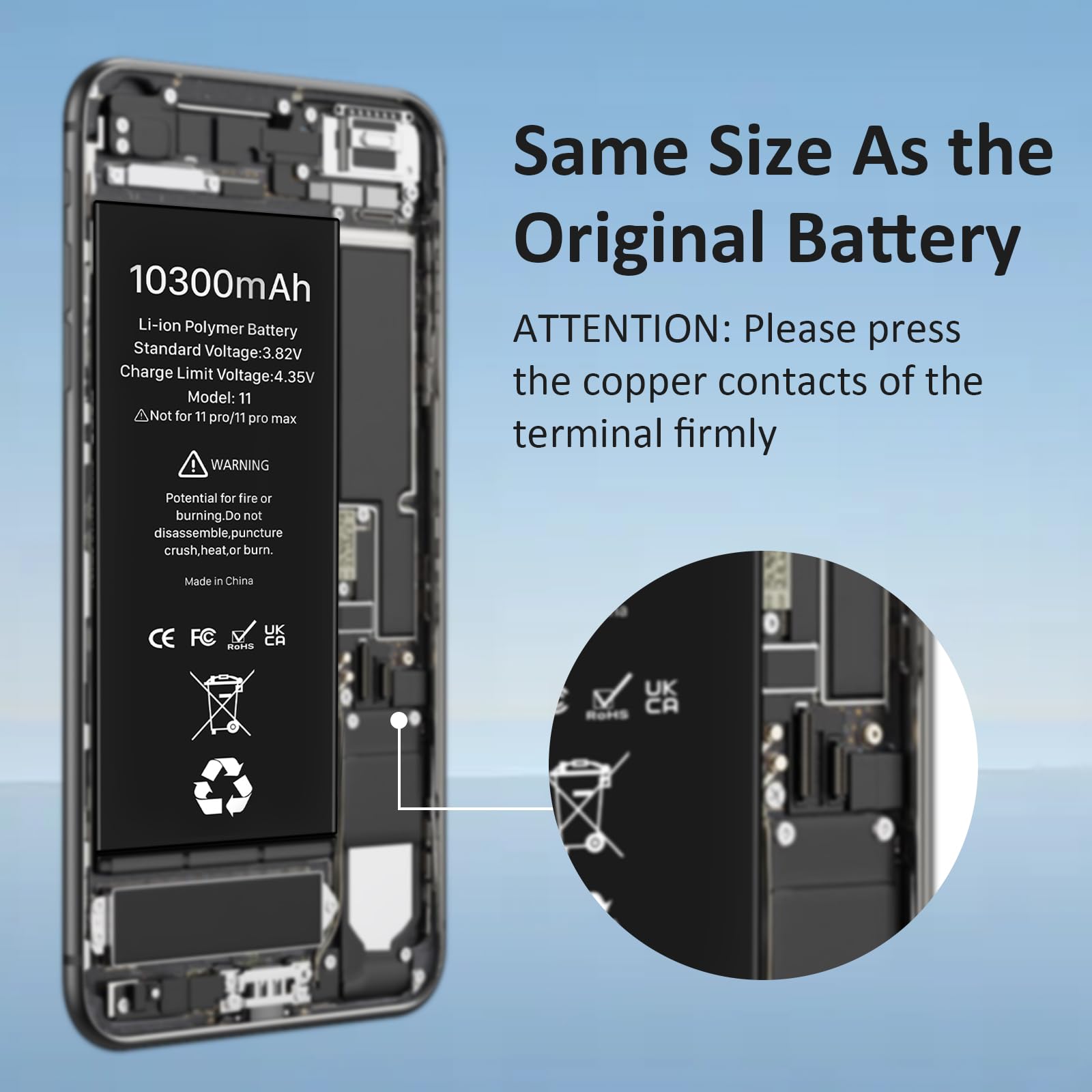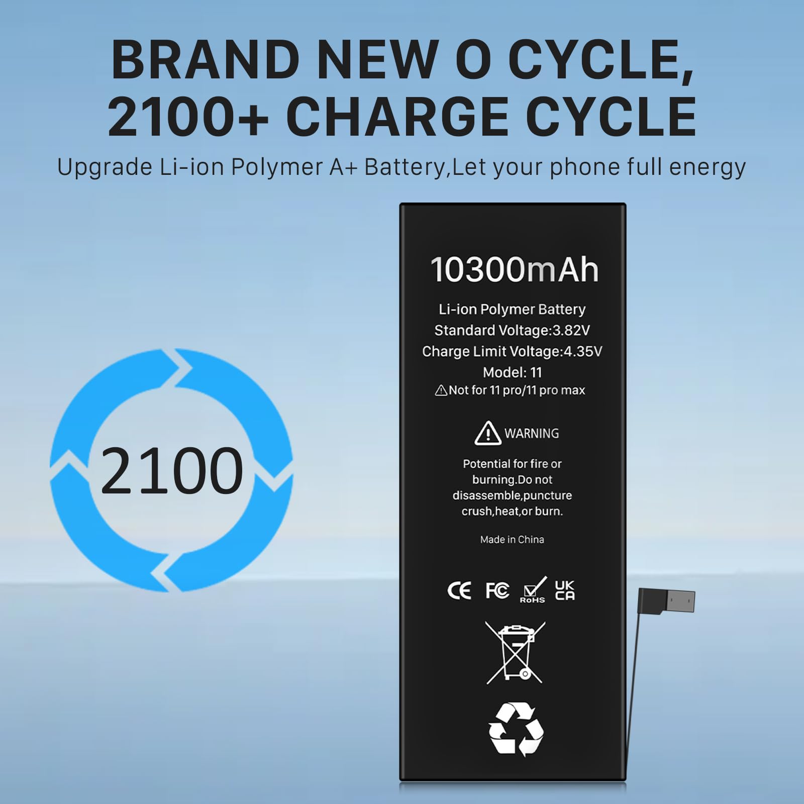 (10300mAh High Capacity) - Our battery replacement for iPhone 11 has upgrade higher capacity, provide your phone more power than other battery, brand new 0 cycle, built to last up to 2100 charging cycles, give your phone a whole new life.