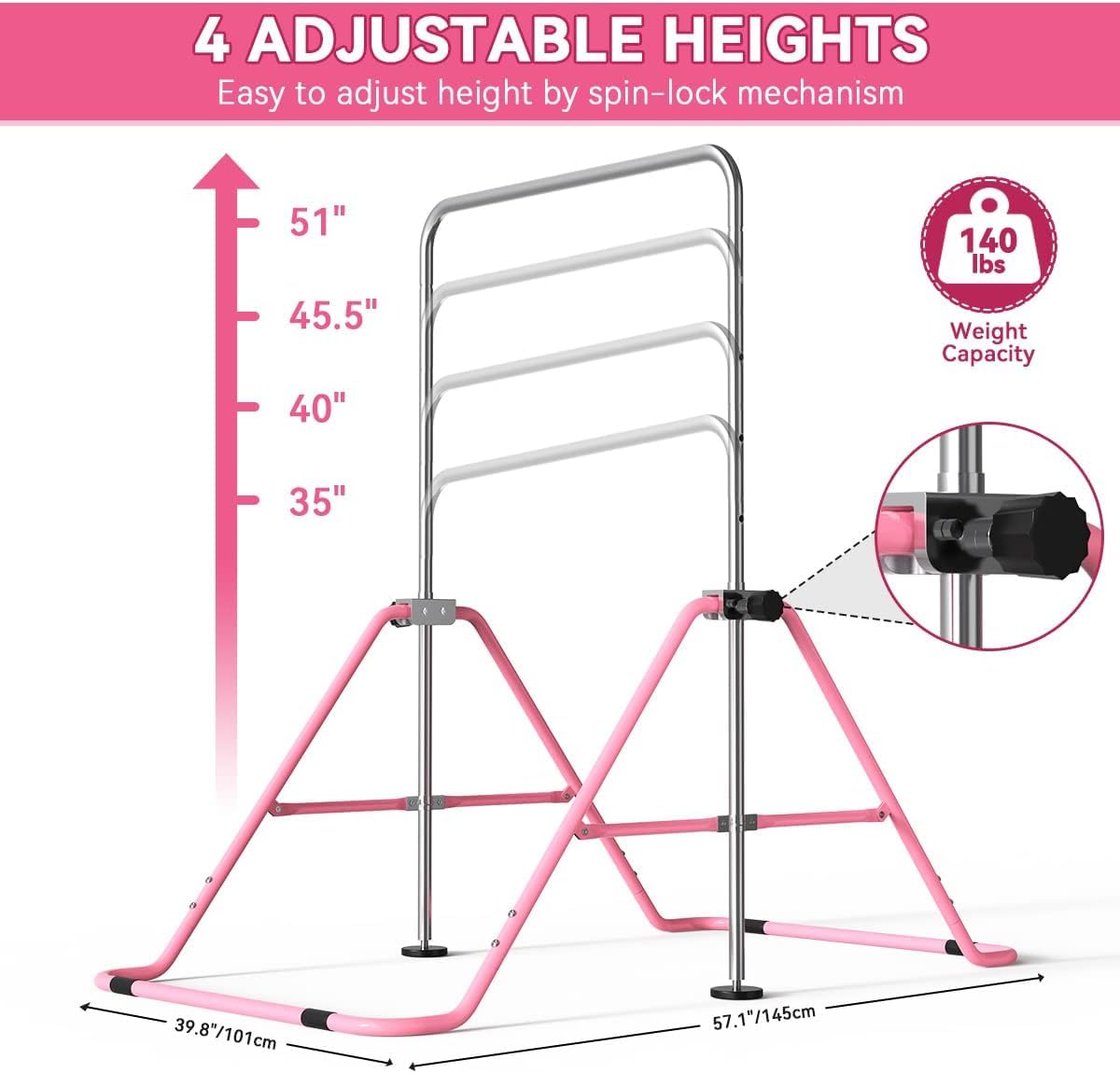 Four Adjustable Heights: The height can be adjusted from 35 "to 51"; This foldable gymnastics bar equipment suitable for users of any age and height as it can be adjusted to their height as they grow