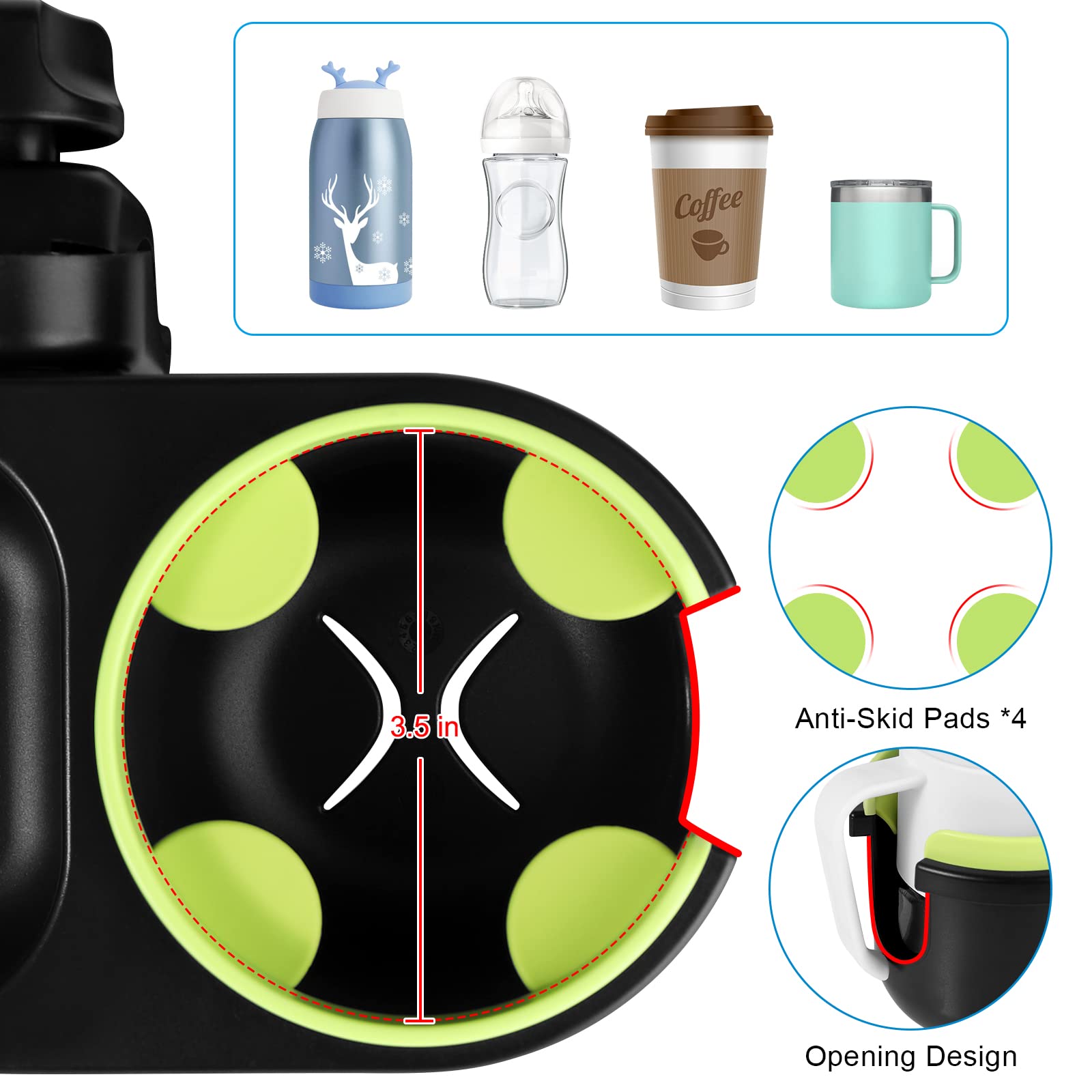 The cup holder with 4 flexible silicone insert can secure different size cups. It is suitable for most bottles, whose diameter less than 90mm / 3.54 in. It fits for baby bottles, water bottles, drink bottles, beverage cups etc.