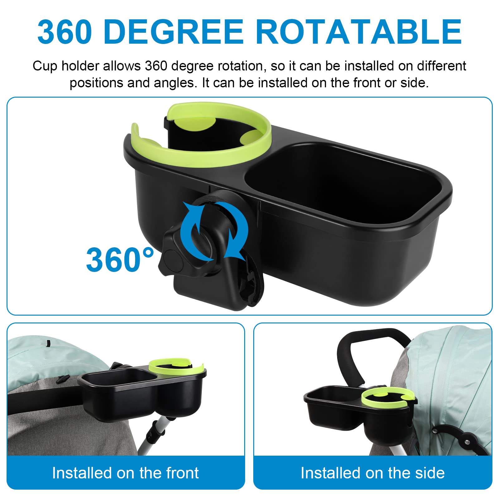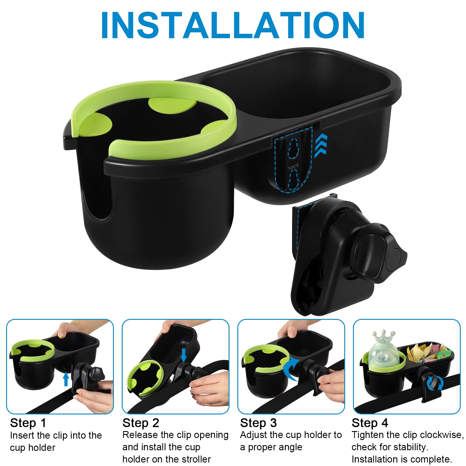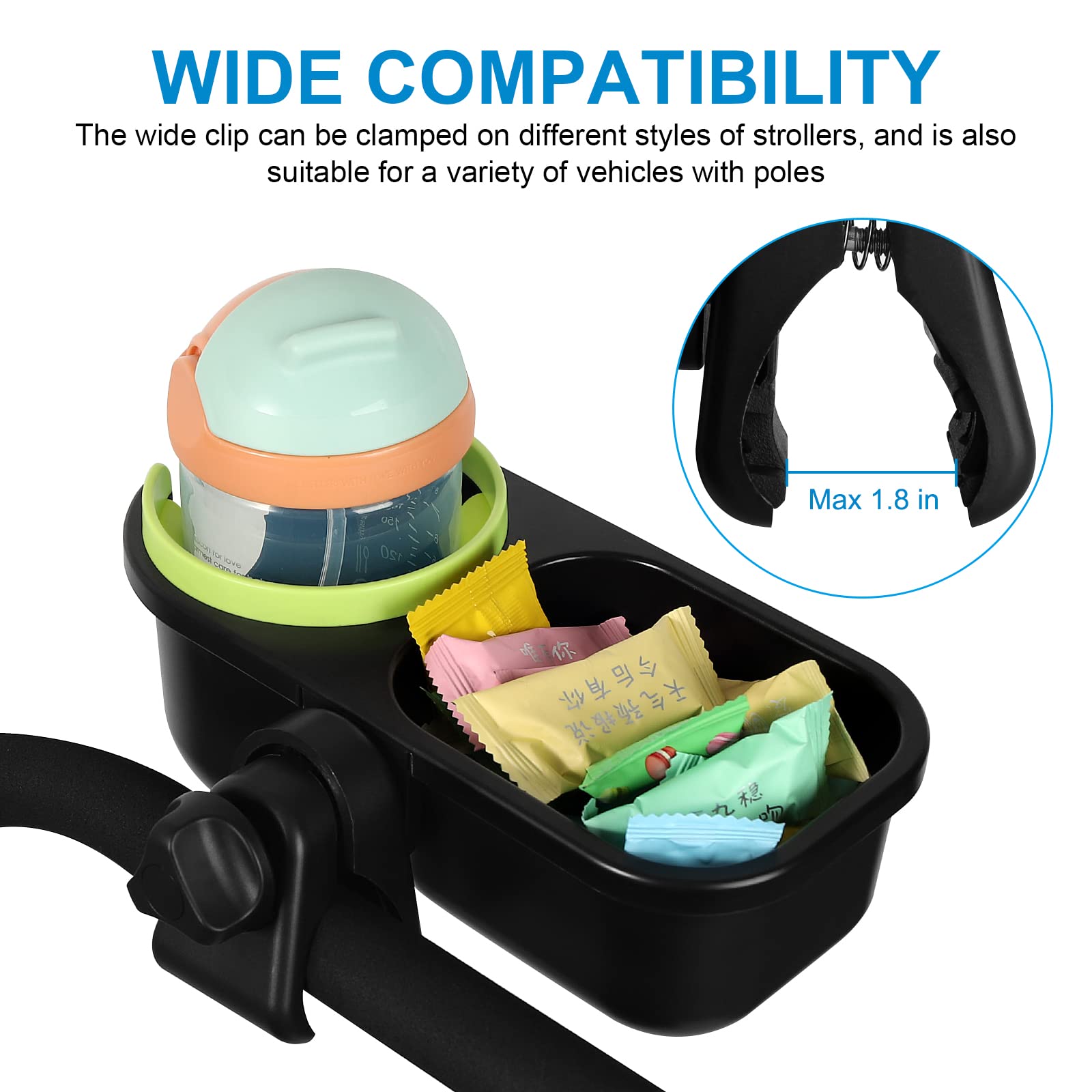 The clamp designed with rubber pad, firmly clip on the stroller rod to avoid sliding. The clip range is 0.55-1.77 in / 14 mm- 45 mm, the width of the clip can freely adjust and firmly clamp on the stroller rod to avoid sliding easily. It also allows 360 degree rotation, so it can be installed on different angle.