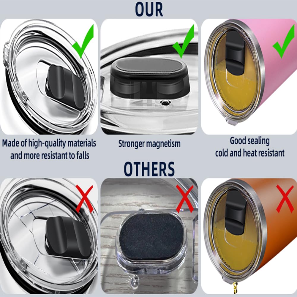 【Transparent and Easy to Clean】These Magnetic Tumbler Lids are crystal clear, the transparent lid allows you to see how much of the drink is left without to open the lid cup. So you can decide whether you're in need of refilling a top off. The black magnetic closure removes easily then rinse the lid under running water, so that easy for you to clean the lids .