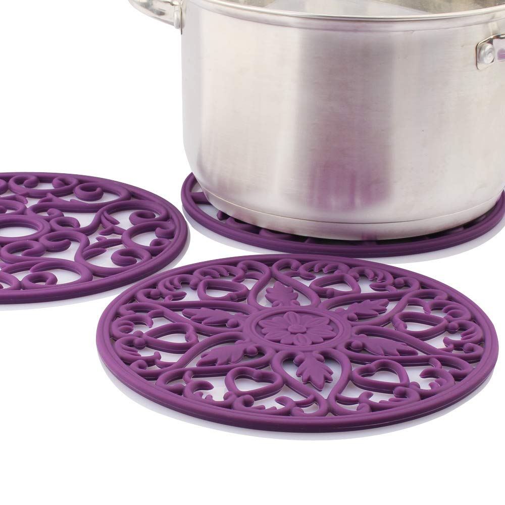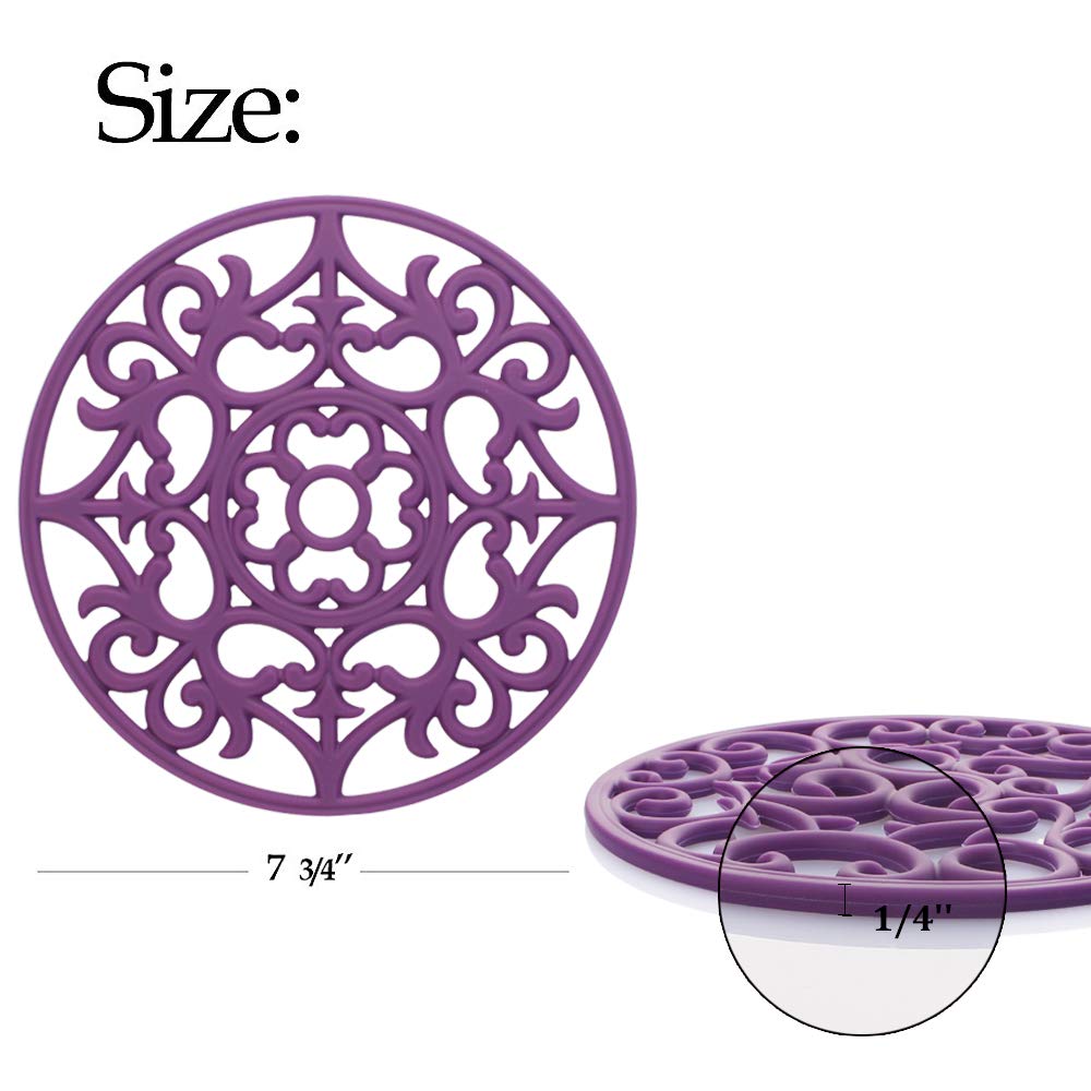 LARGE SIZE TRIVET: The large size:Diameter:7.75 inches; Thickness: 0.25 inches. Extreme temperatures range from -40F to 482F; And the 3 kinds of carving-shaped kitchen components add style and function to your home