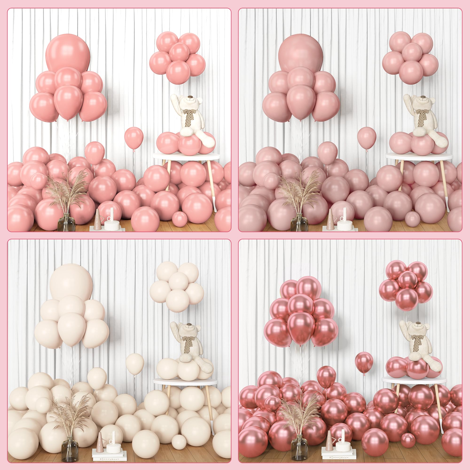 Sufficient Quantity of Dusty Pink Balloons: Dusty pink balloon arch kit includes 18”'dusty pink/white sand/dusty rose pink balloons(3 pcs), 12” dusty pink/white sand/dusty rose pink/metallic rose gold/confetti rose gold balloons(25 pcs), 10” dusty pink/white sand/dusty rose pink/metallic gold balloons (50 pcs), 5” dusty pink/white sand/dusty rose pink/metallic rose gold balloons (65 pcs) and 10 pcs balloon tools(balloon arch strips, tying tool, 100 glue points, ribbon, flower balloon clip, hook)