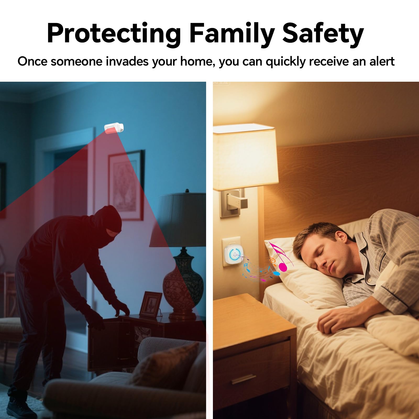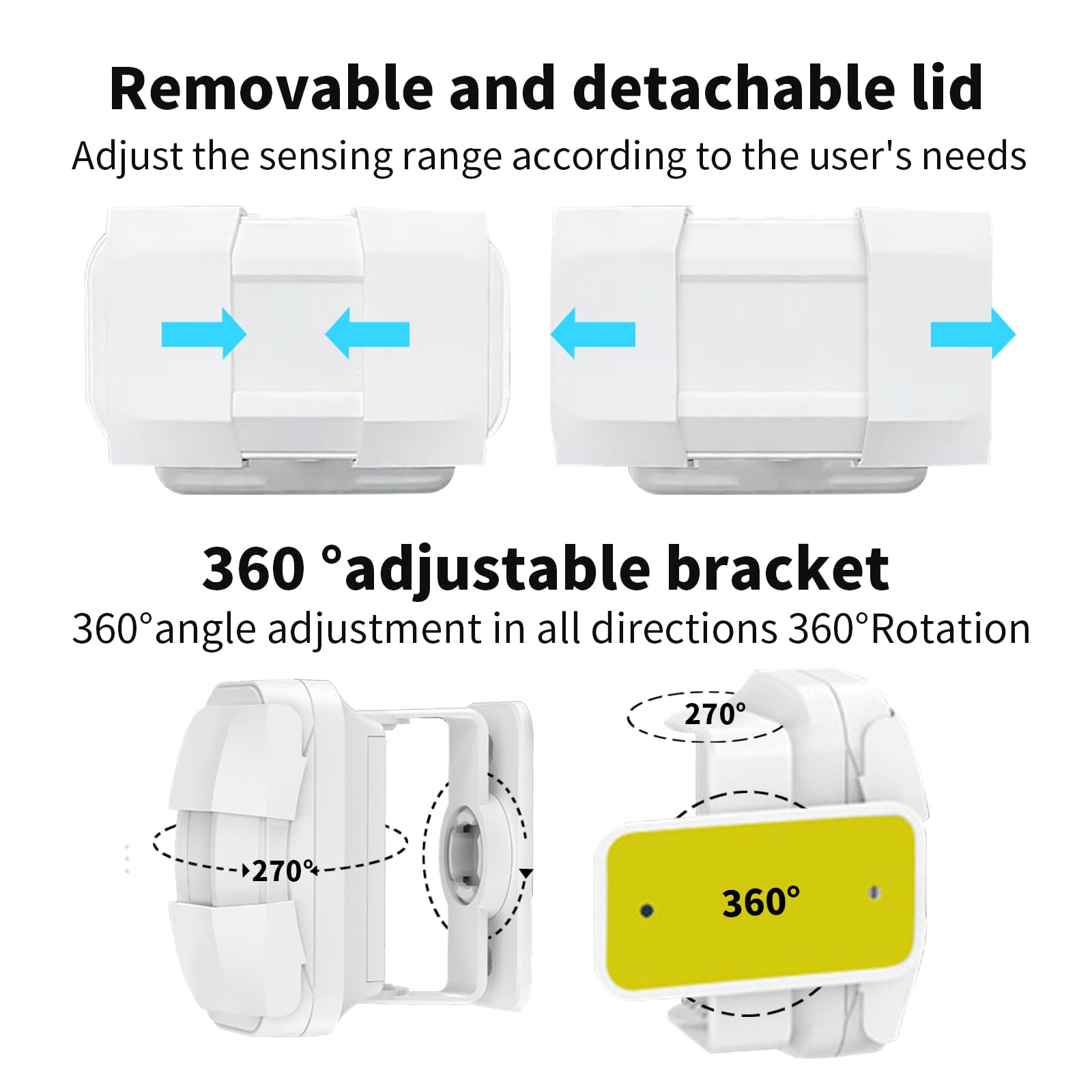 Wide Motion Detection Range : The motion alarm will detect moving people from 33Ft/10M in front of it. Improved motion detection chip and detection angle to reduce the false alarms from sunlight/wind/temperature changes etc. The motion alarm indoor is swivel mount with 360°, and truly realize the various Angle needs of the home care
