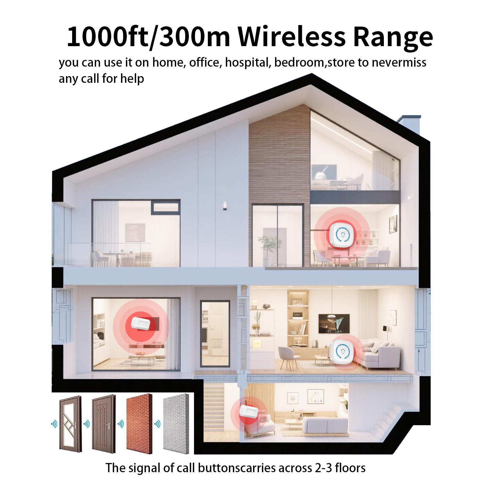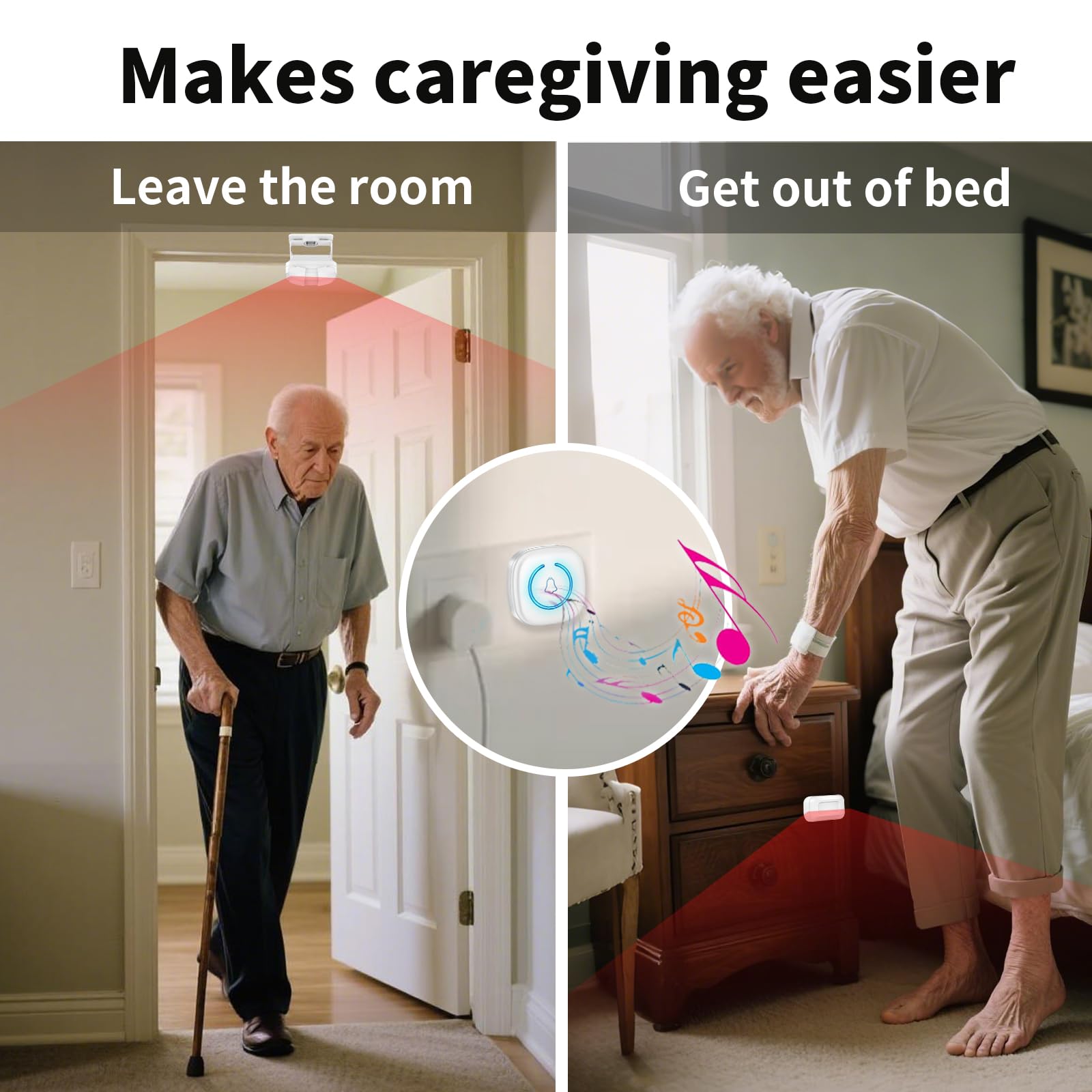 Makes Caregiving Easier: Bed alarm is easy to monitor loved ones getting out of bed or leaving the room,wireless motion sensors can be placed on the floor under the bed to trigger an alarm when the patient's foot is about to touch the ground, or they can be placed at the door to monitor loved ones leaving the room, It transmits the signal to receivers within the 1000ft in open area.