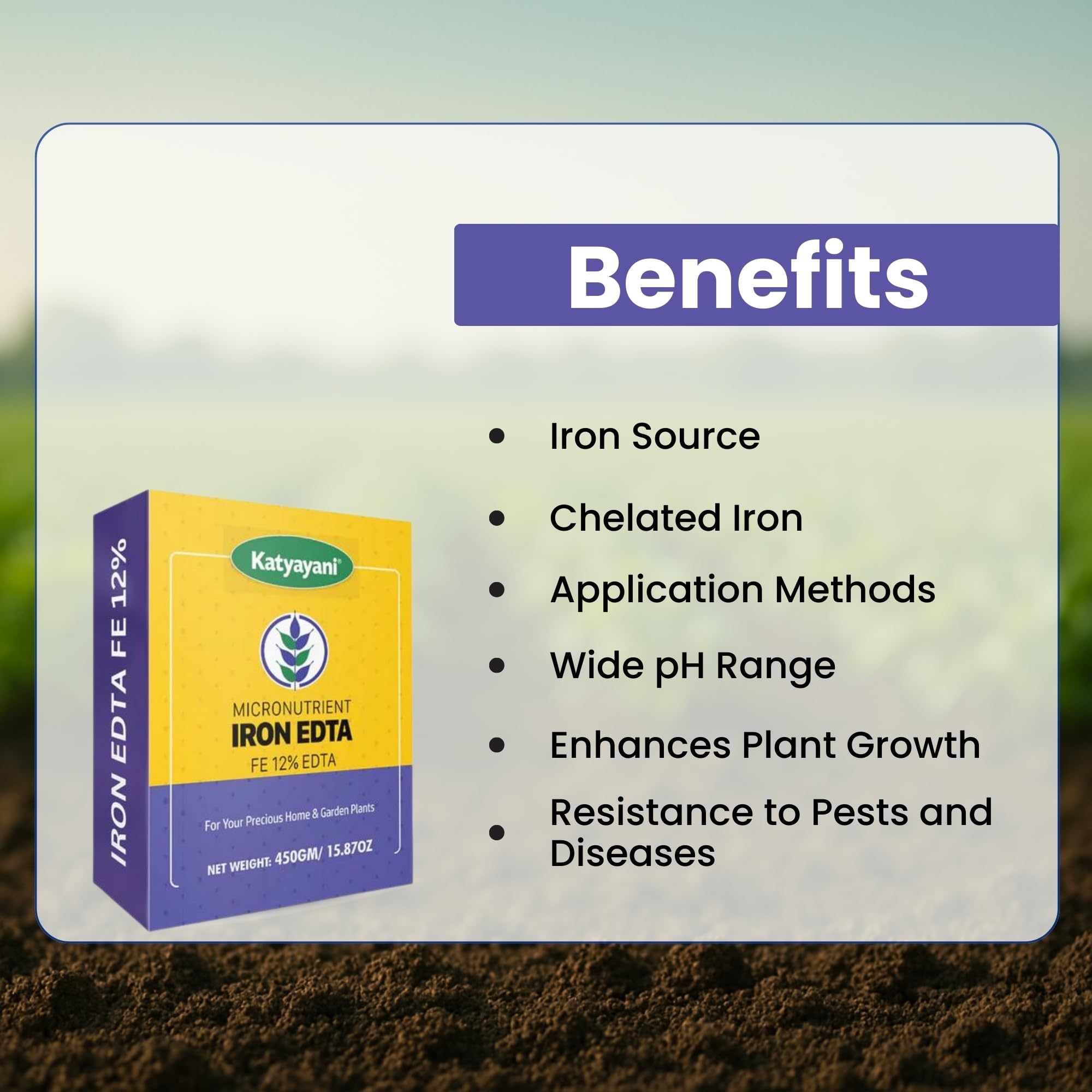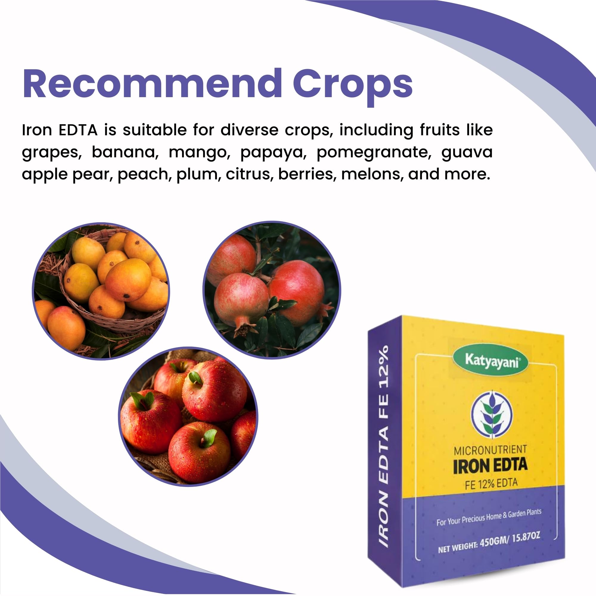 This is the source of Iron. Iron is a micronutrient that is required for plant growth and without it disorders like iron chlorosis occur which results in a reduction in yields. Katyayani Iron EDTA contains 12% Fe and In this product, the Ferrous is chelated by a chelating agent EDTA (Ethylene diamine tetra acetic acid). The product is recommended for soil application as well as a foliar application. This product is widely used to correct or prevent iron deficiencies and iron colorists and it is recommended for soil pH ranging from 4 to 8. This is a free-flowing homogeneous product with pH 5.5 to 6.5. The Fe with the chelating agent is readily available to the crops when given through spraying. Benefits: Katyayani Iron EDTA stimulates and regulates enzyme reactions for the growth and development of crops as iron activates several enzymes. Katyayani Iron EDTA increases the chlorophyll content of healthy green leaves. It also prevents chlorosis and the spiraling of leaves. It induces resistance to pests and diseases further. It boosts growth rate, dry matter accumulation, and increases yields. Katyayani Iron EDTA helps to prevent Iron Deficiencies in different crops occurred gradually at different growth stages of crops. It can be used on a wide range of soil pH (4.0 – 8.0) to prevent permanent deficiencies. Katyayani Iron EDTA is chelated by special chelating agents and hence uptake of these nutrients is more compared to conventional micronutrients. Due to chelating agents, these elements are slowly available to the plants for a longer period. It can be used through drip irrigation as well as through foliar applications to correct deficiencies. It can be used in hydroponics. Can use it in Aquaponics.
