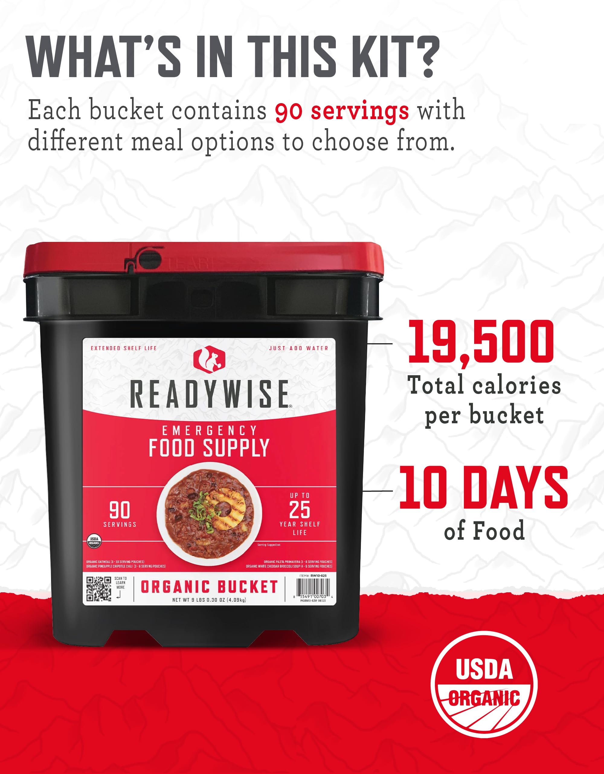SURVIVAL ESSENTIAL: With 90 servings of meals, ReadyWise Organic Bucket is the perfect starting point for anyone serious about preparing for the future. Stay ready for anything, from power outages to outdoor adventures!