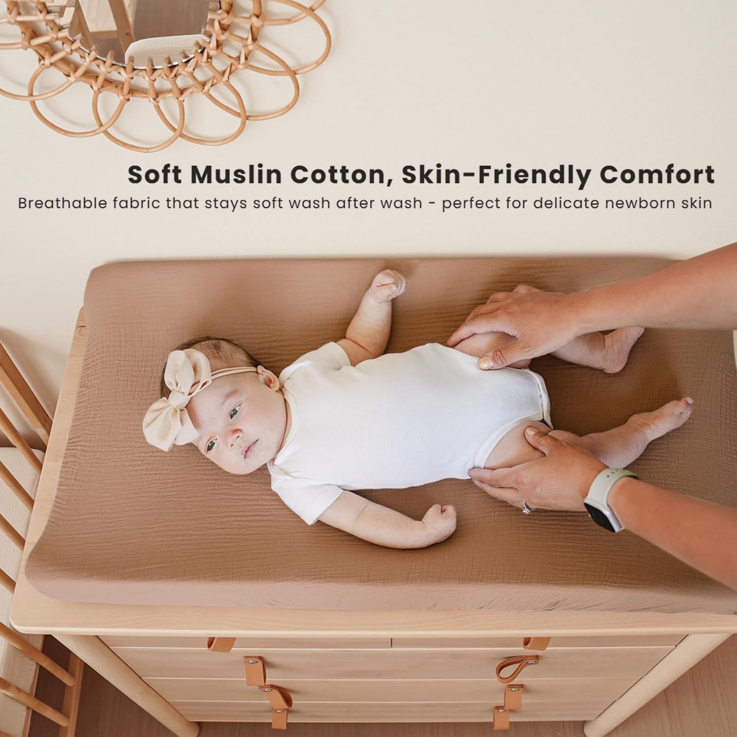Soft and Gentle Fabric: Our muslin changing pad cover is made from soft and gentle muslin fabric, providing a comfortable surface for your baby's diaper changes. The fabric is delicate against your baby's skin and retains its color after being washed several times