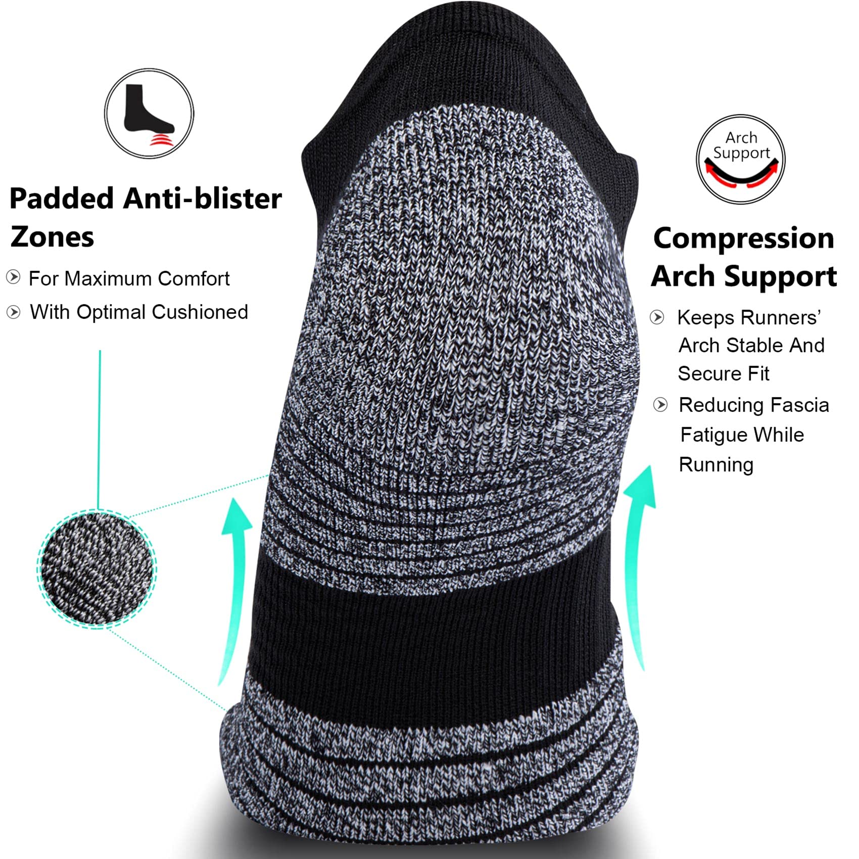 Cushioned, Anti-blister and Arch Support: Terry structure socks can absorb impact and relieve foot fatigue to promise no blisters after long time exercise; Durability with power bands made of elastic to hug your foot for maximum support, reducing fascia fatigue in running, hiking, cycling, golf, tennis, yoga, gym and other sports
