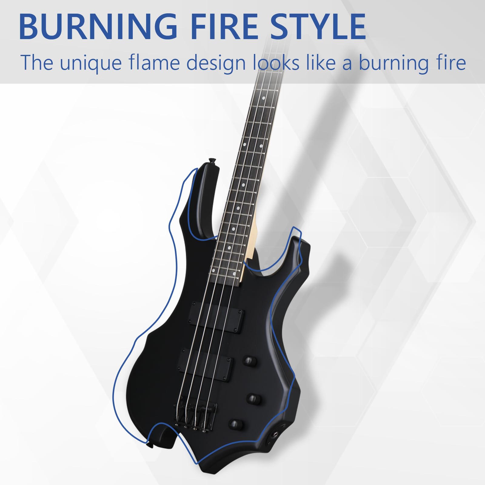UNIQUE DESIGN: This 4-string rock bass has a novel flame shape that looks like a burning flame. The superior shell inlay on the rosewood fretboard is eye-catching and makes this bass even more distinctive. This special bass could be a surprising gift for music lovers