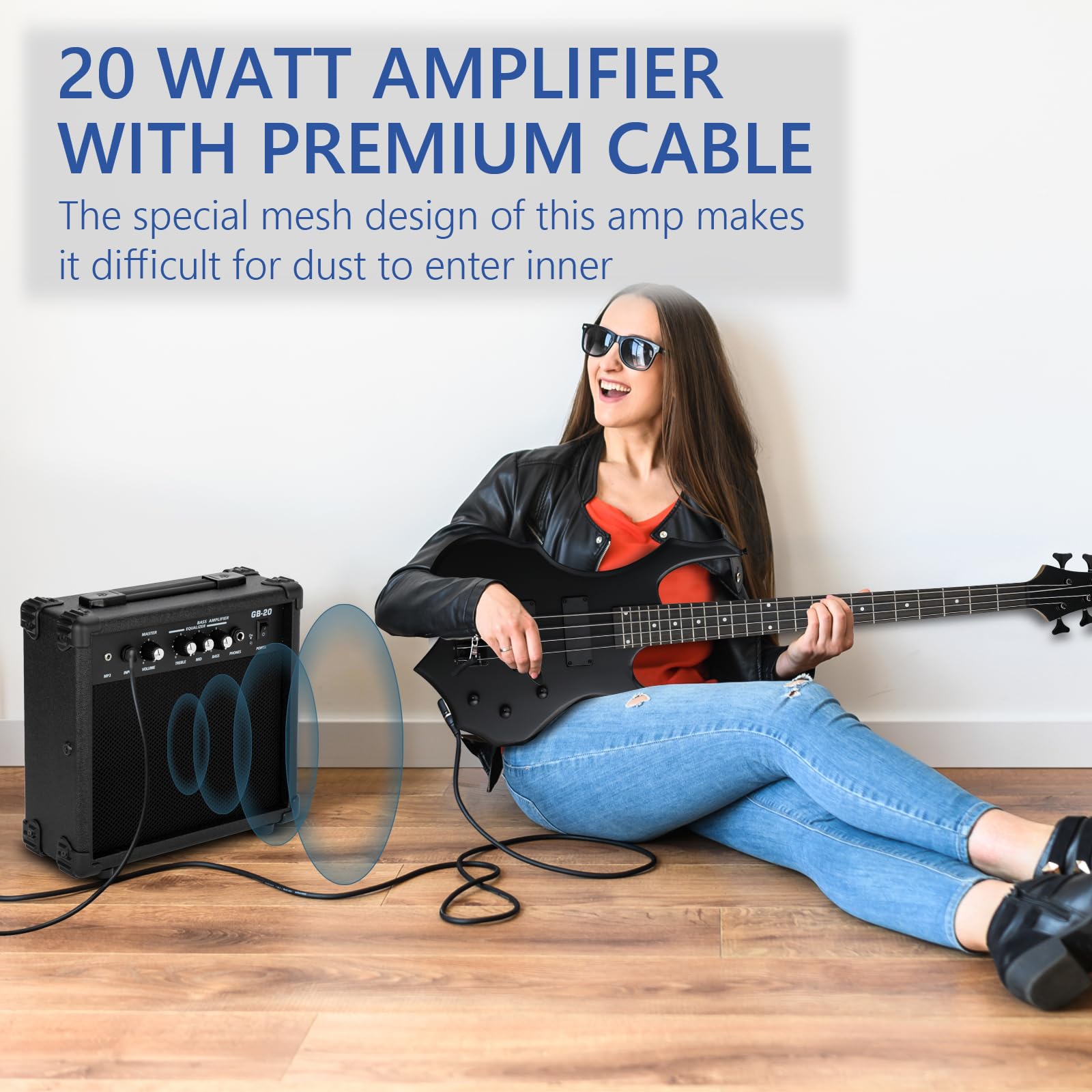 SUITABLE FOR ALL SKILL LEVELS: The 20 Watt Amplifier with built-in speaker, headphone output & input jack. It can be used with a 4-string bass guitar to better play a variety of sounds. This electric bass set is a great choice for beginners to experienced musicians of all levels