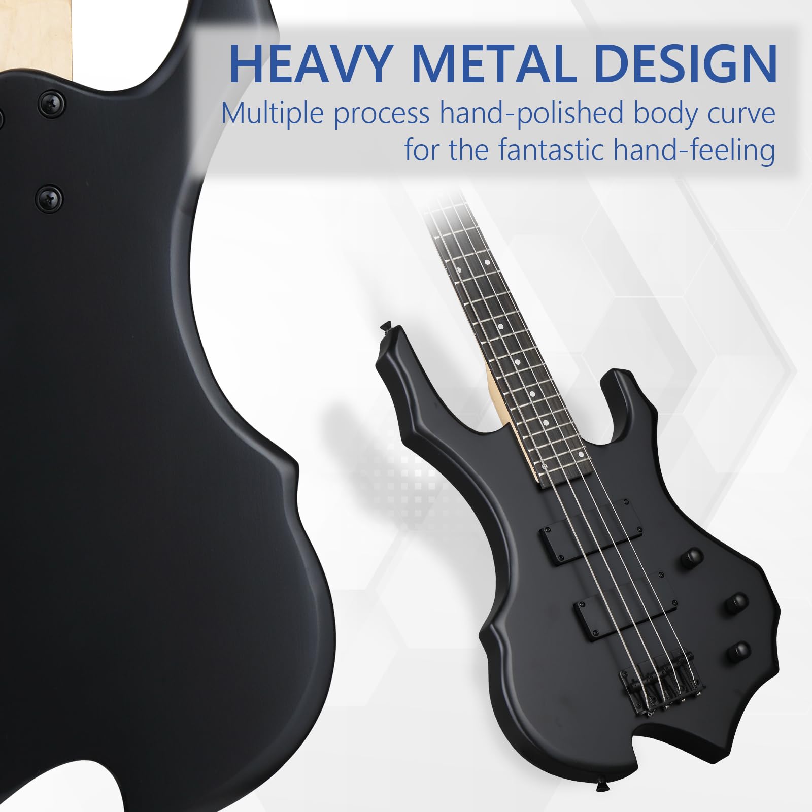 EXQUISITE CRAFTSMANSHIP: The streamlined headstock design of full size bass guitar keeps the string tension straight from the bolt to the tuner to improve stability and suppress murmur. The whole body of the electric bass is cut in a three-dimensional manner, which realizes the overall lightweight and enhances the comfort of playing